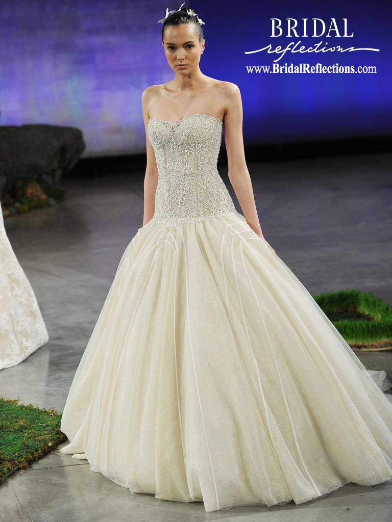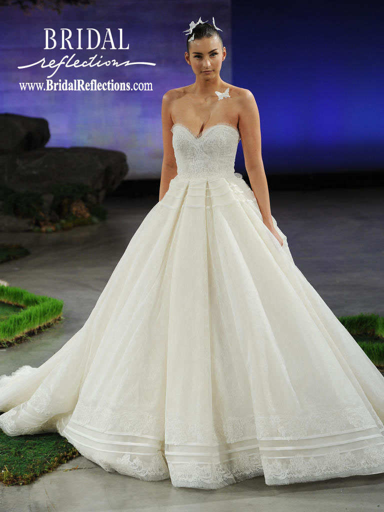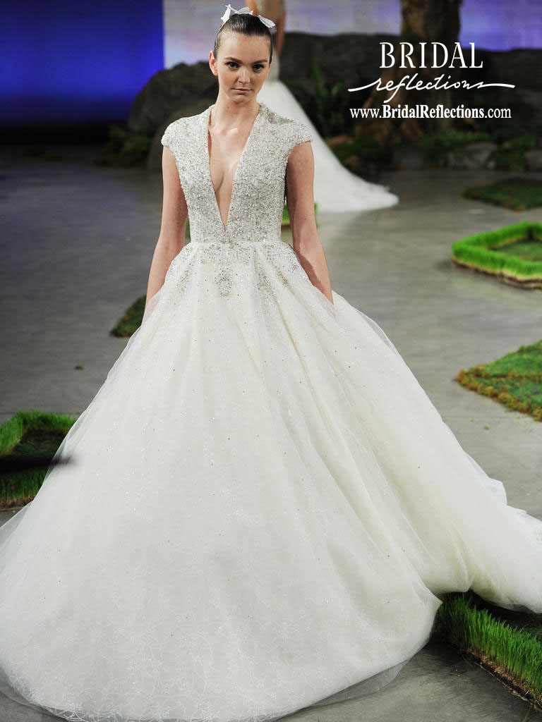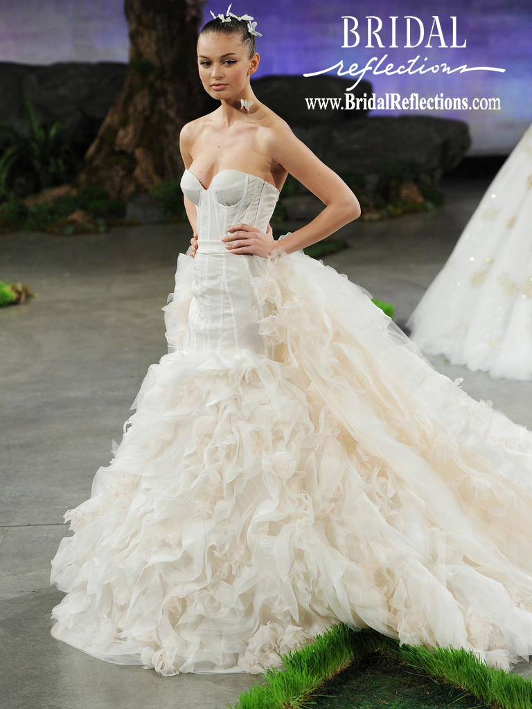 We fell in love at New York Bridal Fashion week over the latest Ines Di Santo collection! The spring 2016 collection was inspired by the beautiful elements of spring. In true Ines style they showcased her signature fitted corset ball gown, flirty fit and flares, detachable overskirts in tiered layers of silk organza, delicate floral lace embroidery, romantic crystal/pearls that draped off-the-shoulder and dramatic illusion necklines.
