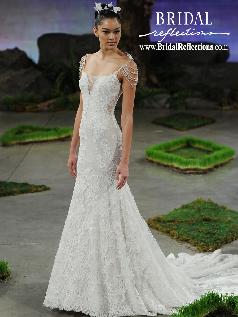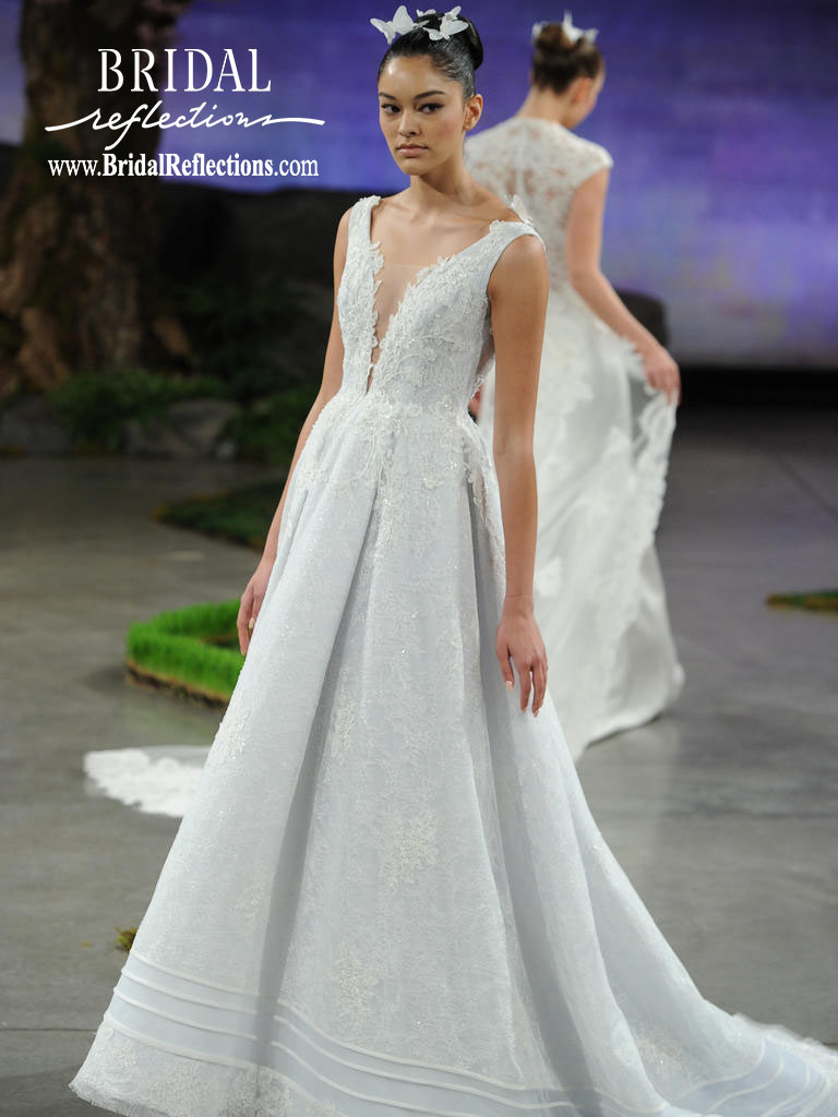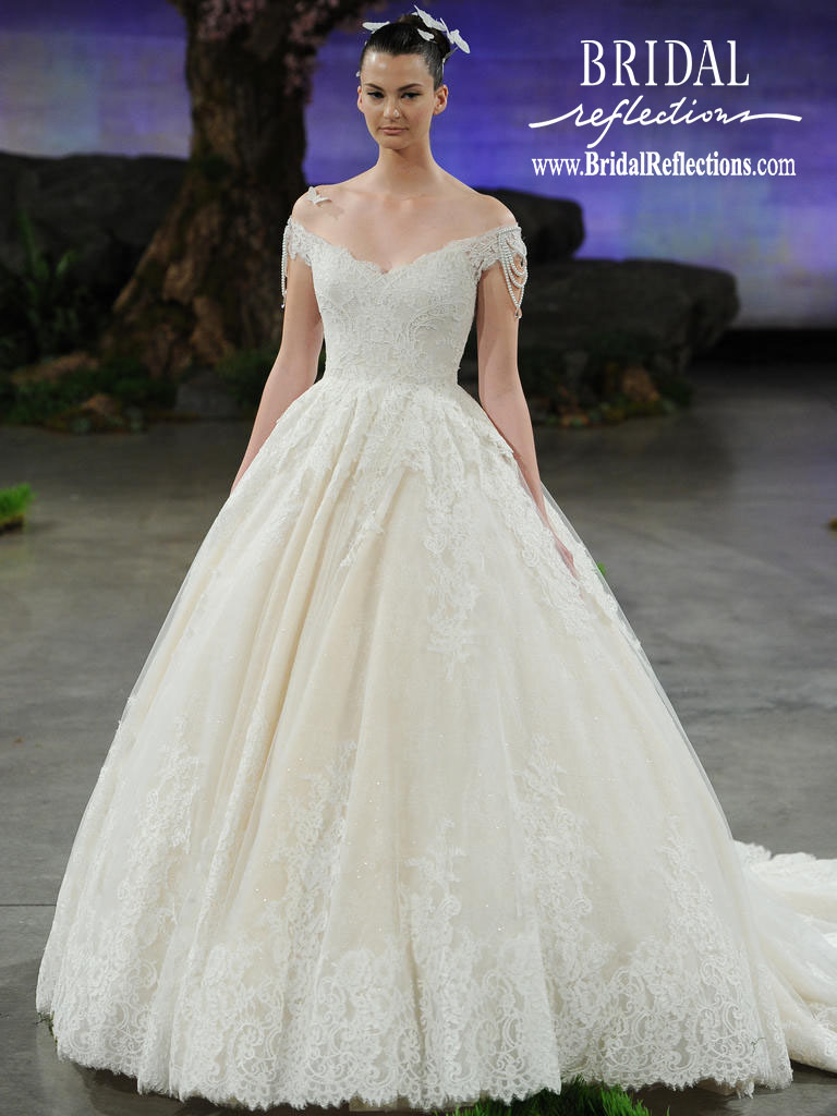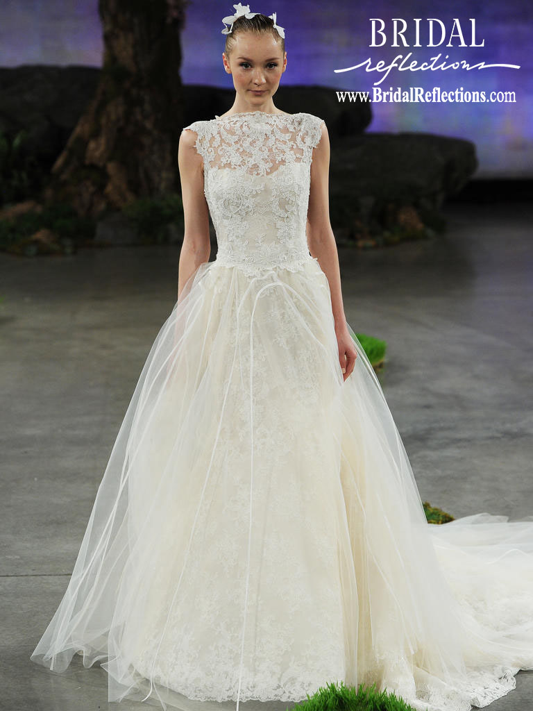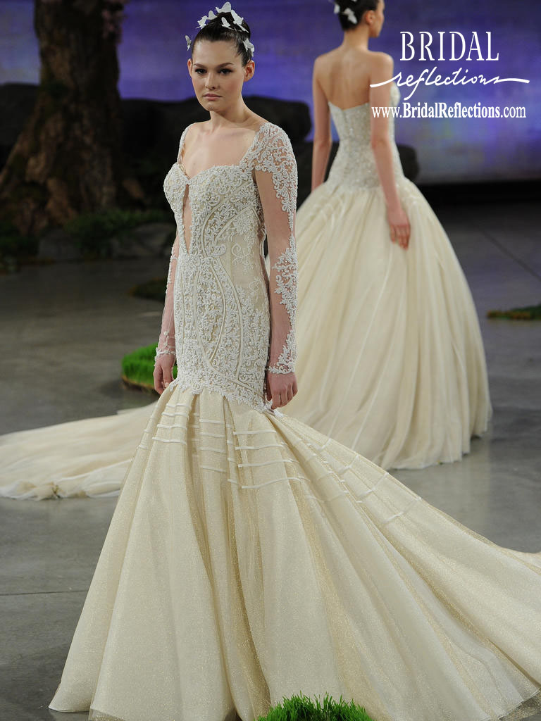 We fell in love at New York Bridal Fashion week over the latest Ines Di Santo collection! The spring 2016 collection was inspired by the beautiful elements of spring. In true Ines style they showcased her signature fitted corset ball gown, flirty fit and flares, detachable overskirts in tiered layers of silk organza, delicate floral lace embroidery, romantic crystal/pearls that draped off-the-shoulder and dramatic illusion necklines.
