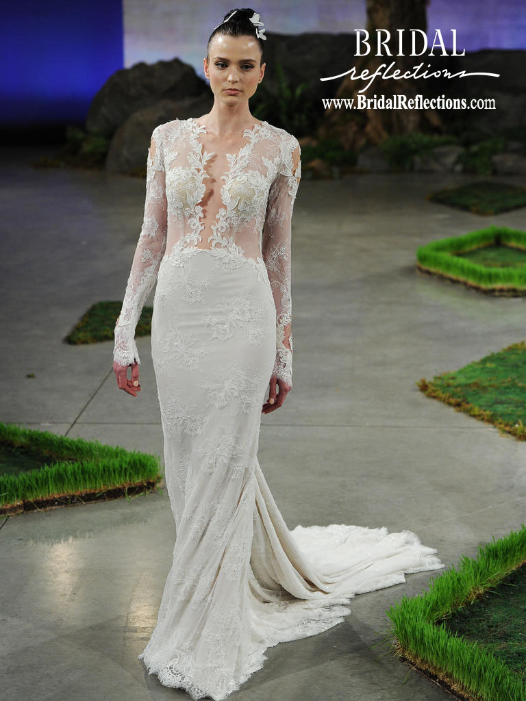 Sensual sheath gown with illusion sleeves, layered guipure and chantilly lace and sweep train.