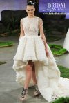 Romantic high-low gown, jeweled shoulder and back, embroidered alencon sleeveless bodice with textured ruffled skirt.
