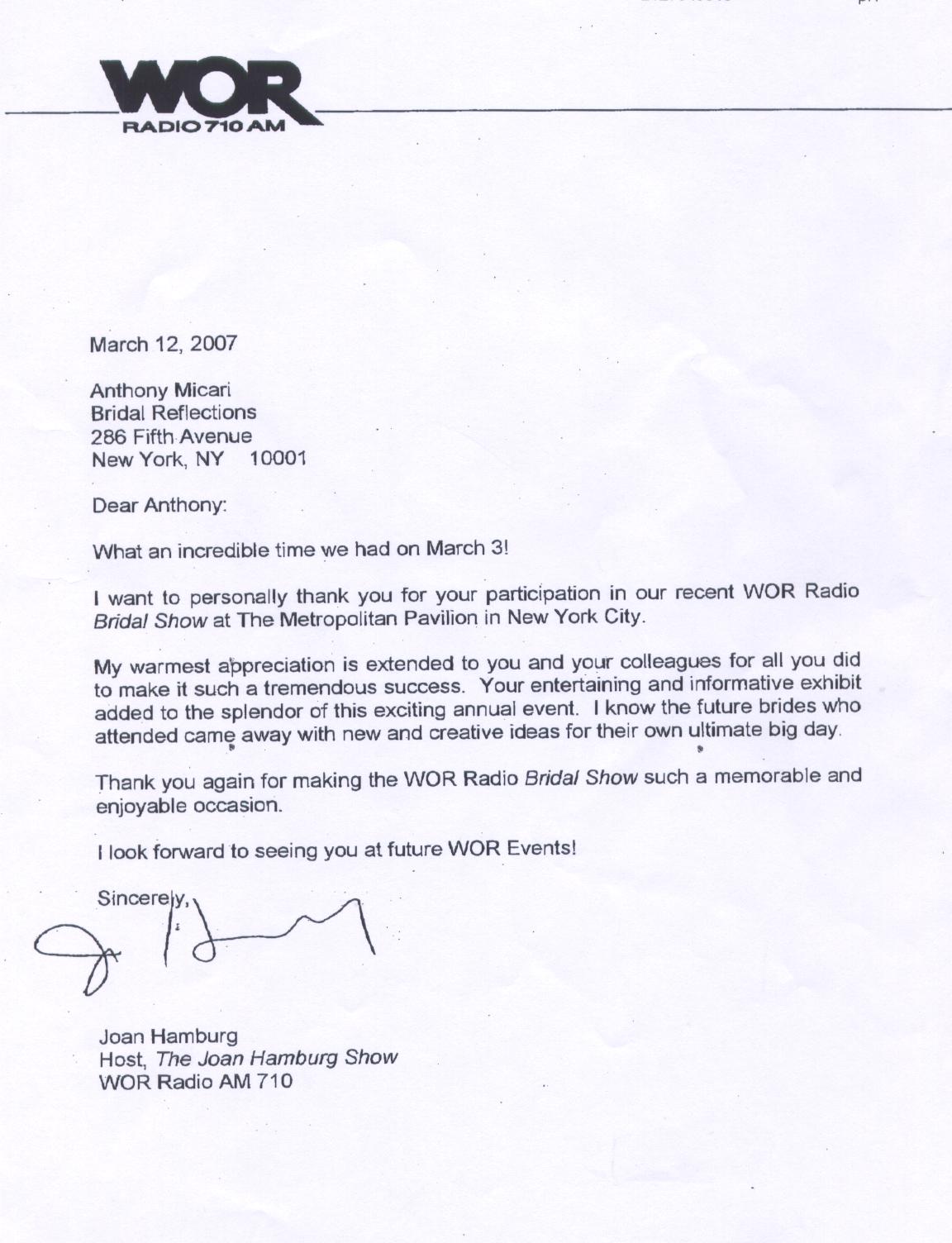 On March 3rd, 2007, Bridal Reflections hosted the fashion show at the WOR Radio Bridal Show held at the Metropolitan Pavilion in New York City. They showcased a variety of their top designers, many of whom personally attended. The show was hosted by the owner of the salon as well as Joan Hamburg, one of radio’s most endearing personalities. It truly showcased the fashion that makes Bridal Reflections the only salon a bride need visit.