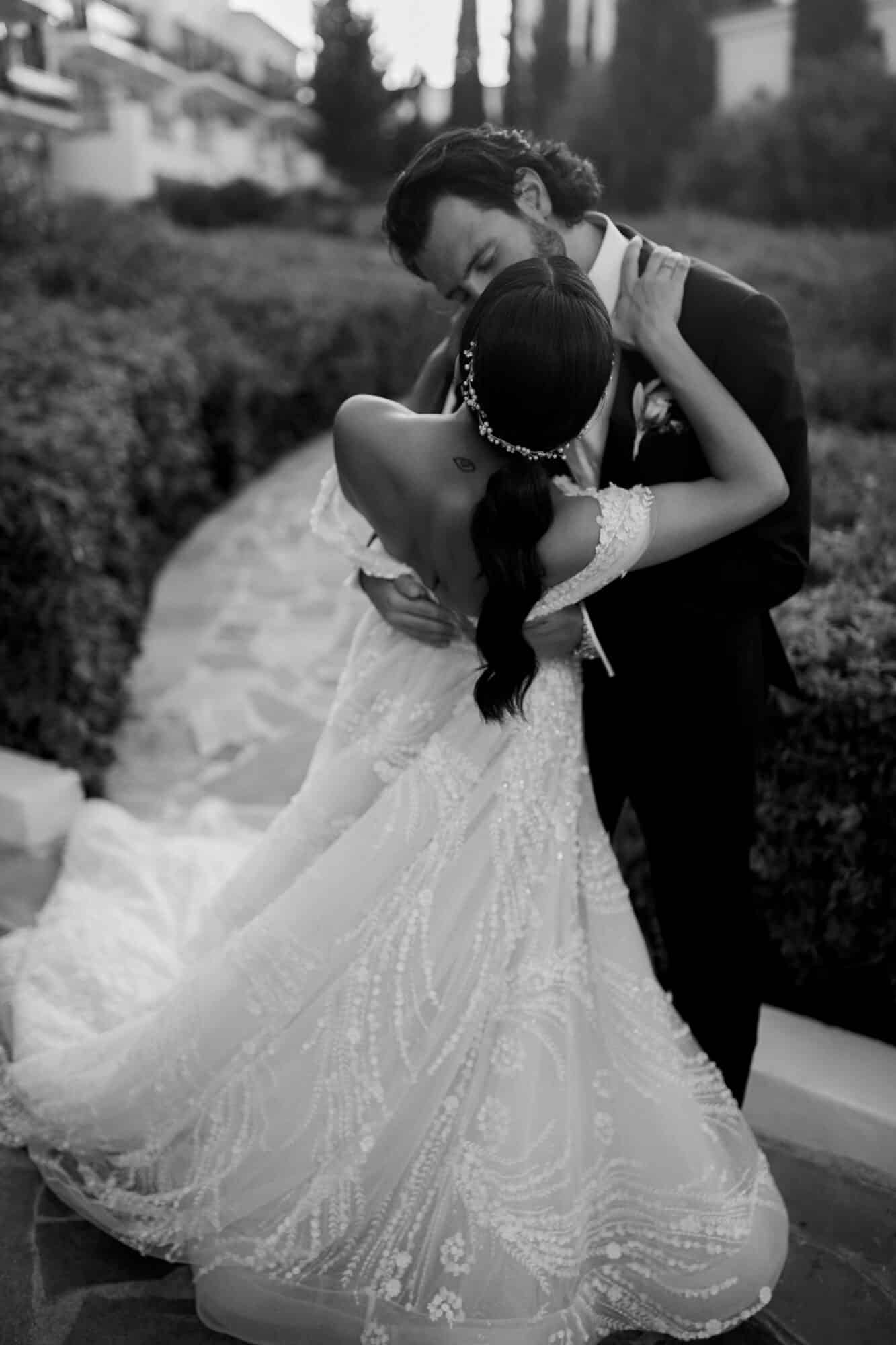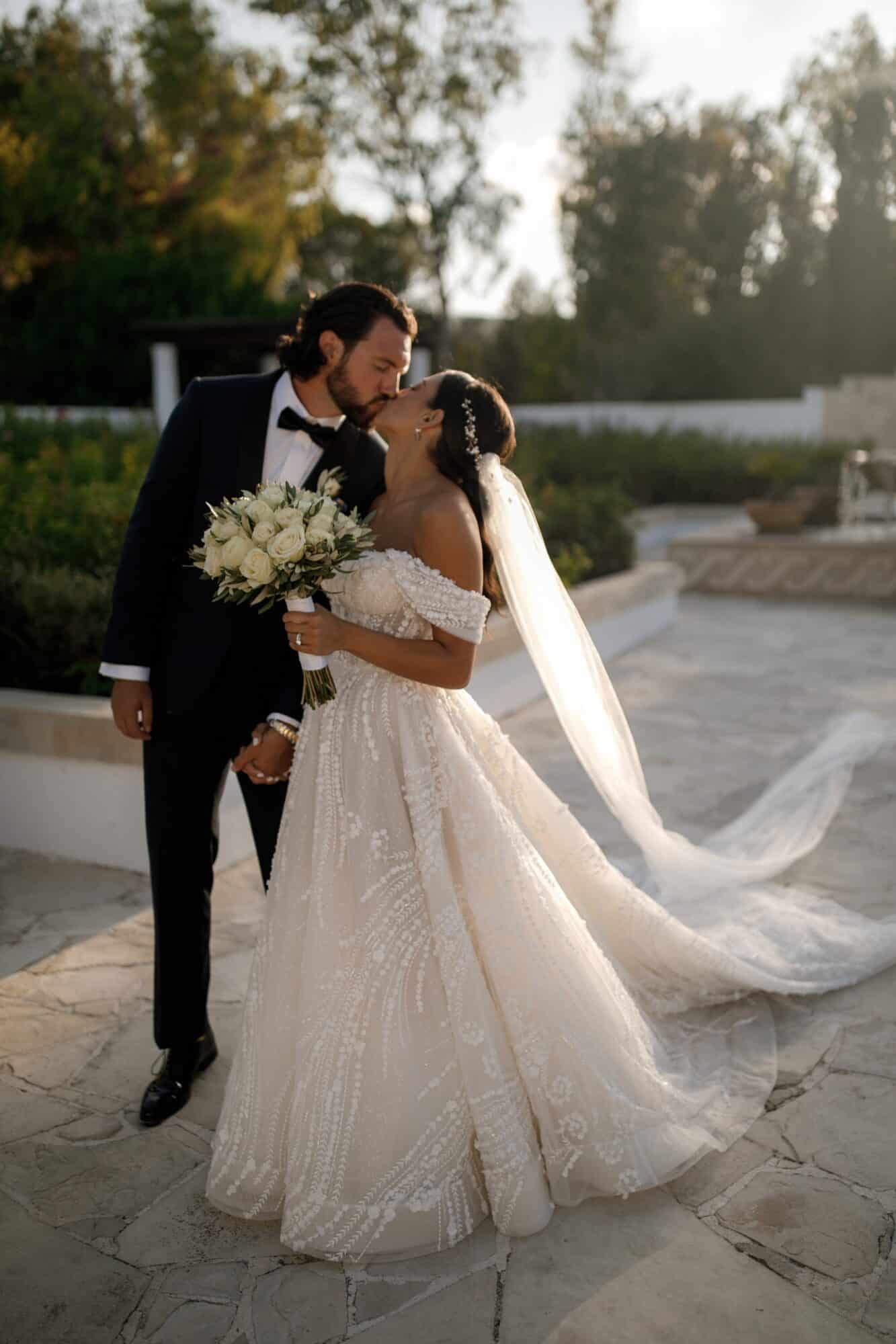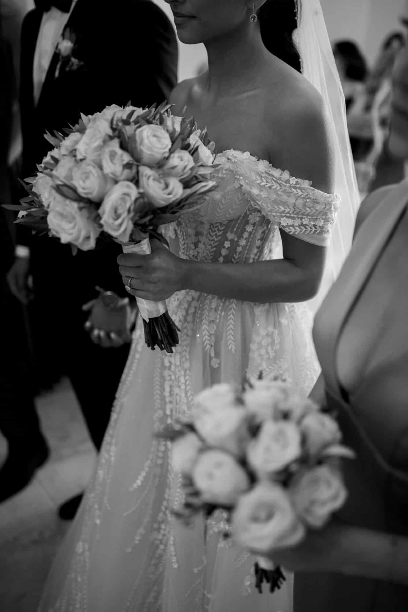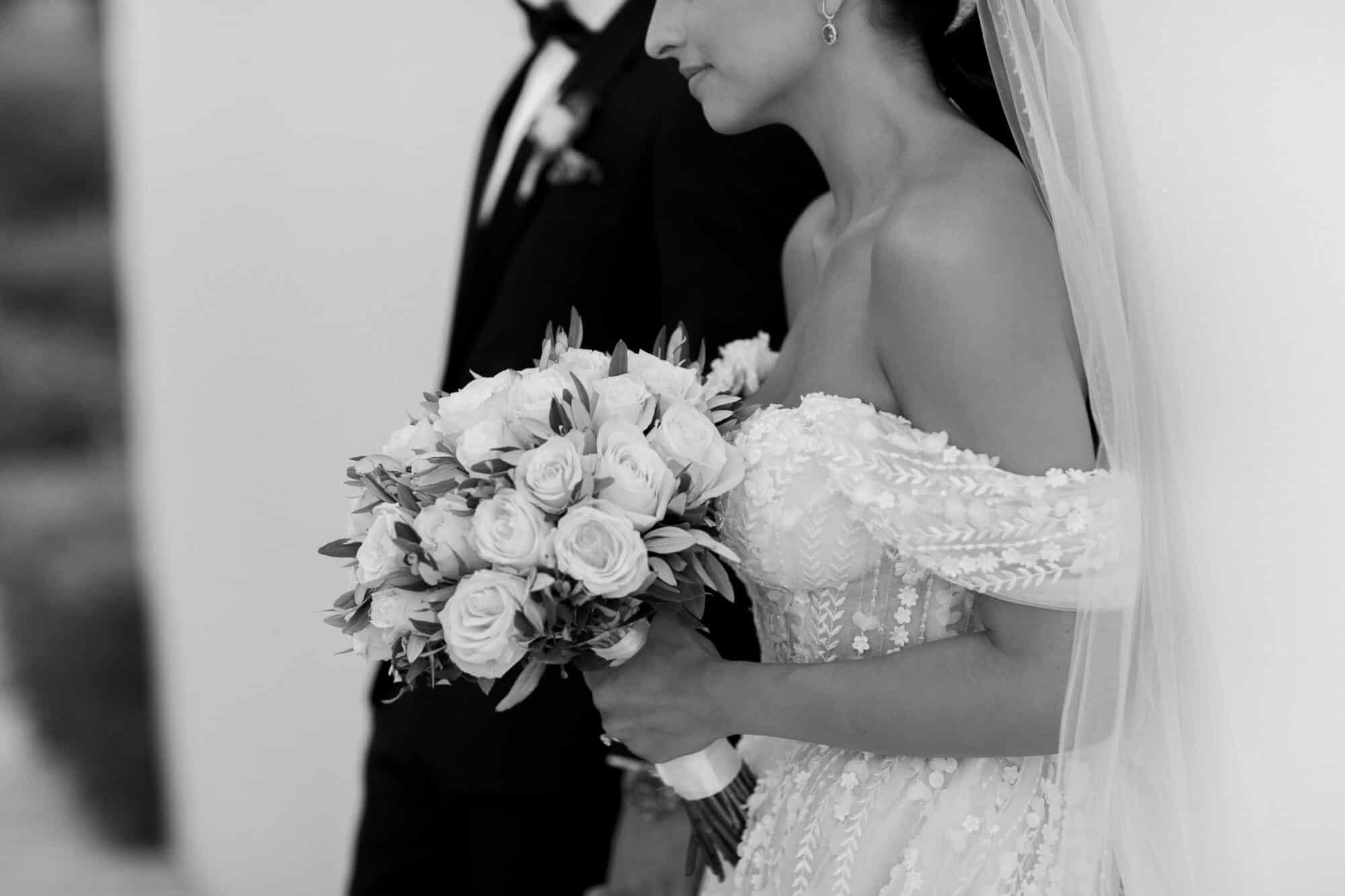 Our bride Adrianna is wearing a customized version of style 361 by Eve of Milady’s Amalia Carrara line. Originally a long sleeve, sheer, three-dimensional a-line ball gown featuring a sculptured neckline with a sheer three-dimensional bodice and matching chapel train. Adrianna worked with our seamstress’ to create custom off-the-shoulder sleeves to match.