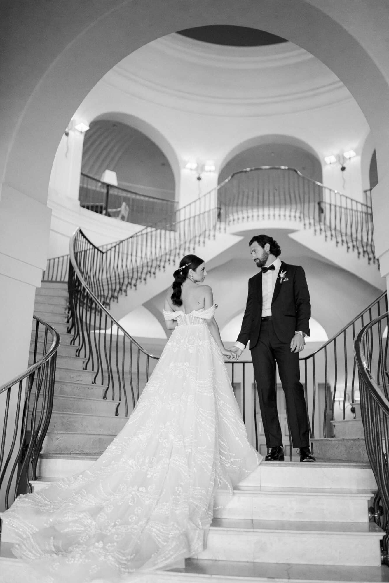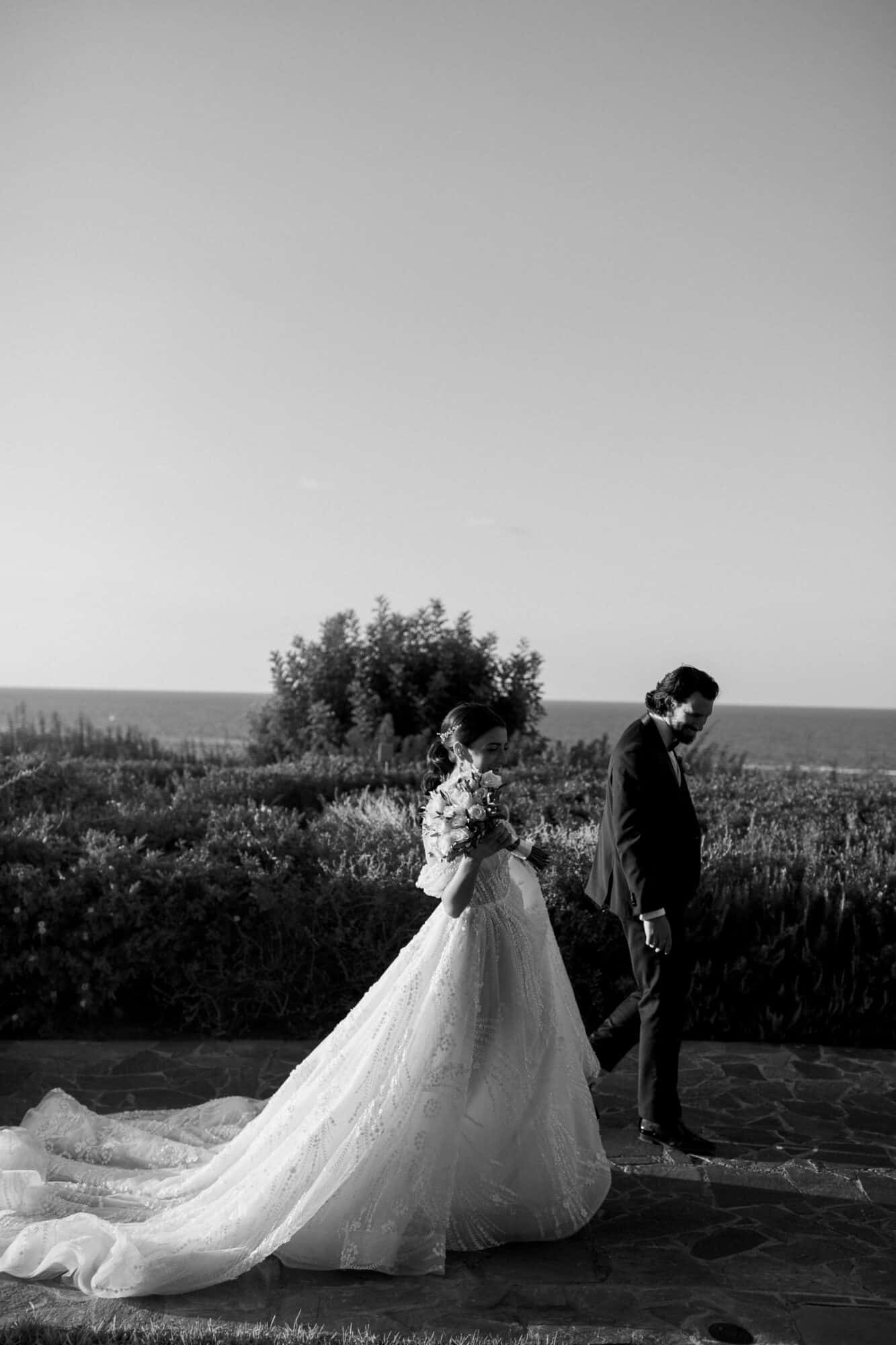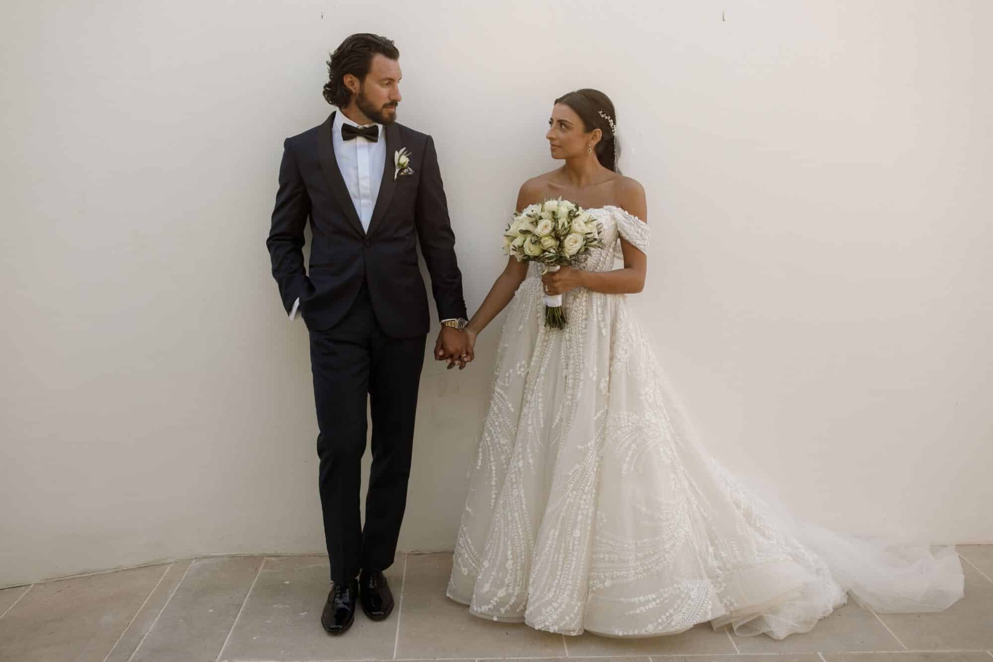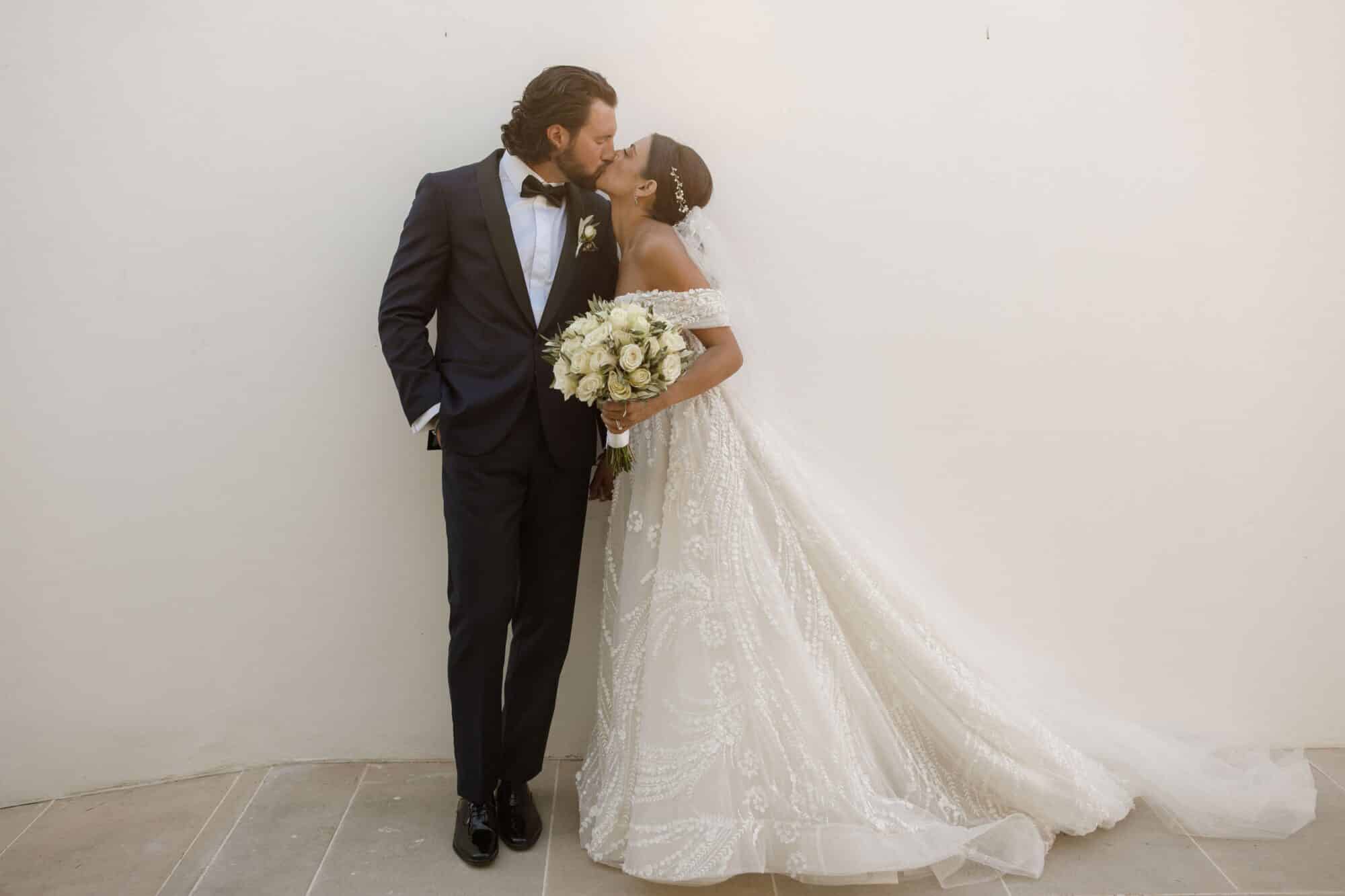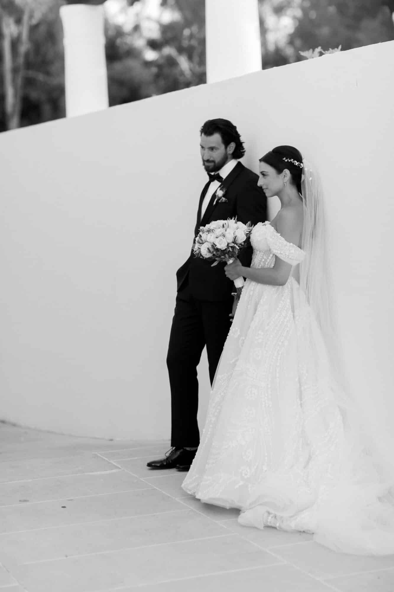 Our bride Adrianna is wearing a customized version of style 361 by Eve of Milady’s Amalia Carrara line. Originally a long sleeve, sheer, three-dimensional a-line ball gown featuring a sculptured neckline with a sheer three-dimensional bodice and matching chapel train. Adrianna worked with our seamstress’ to create custom off-the-shoulder sleeves to match.