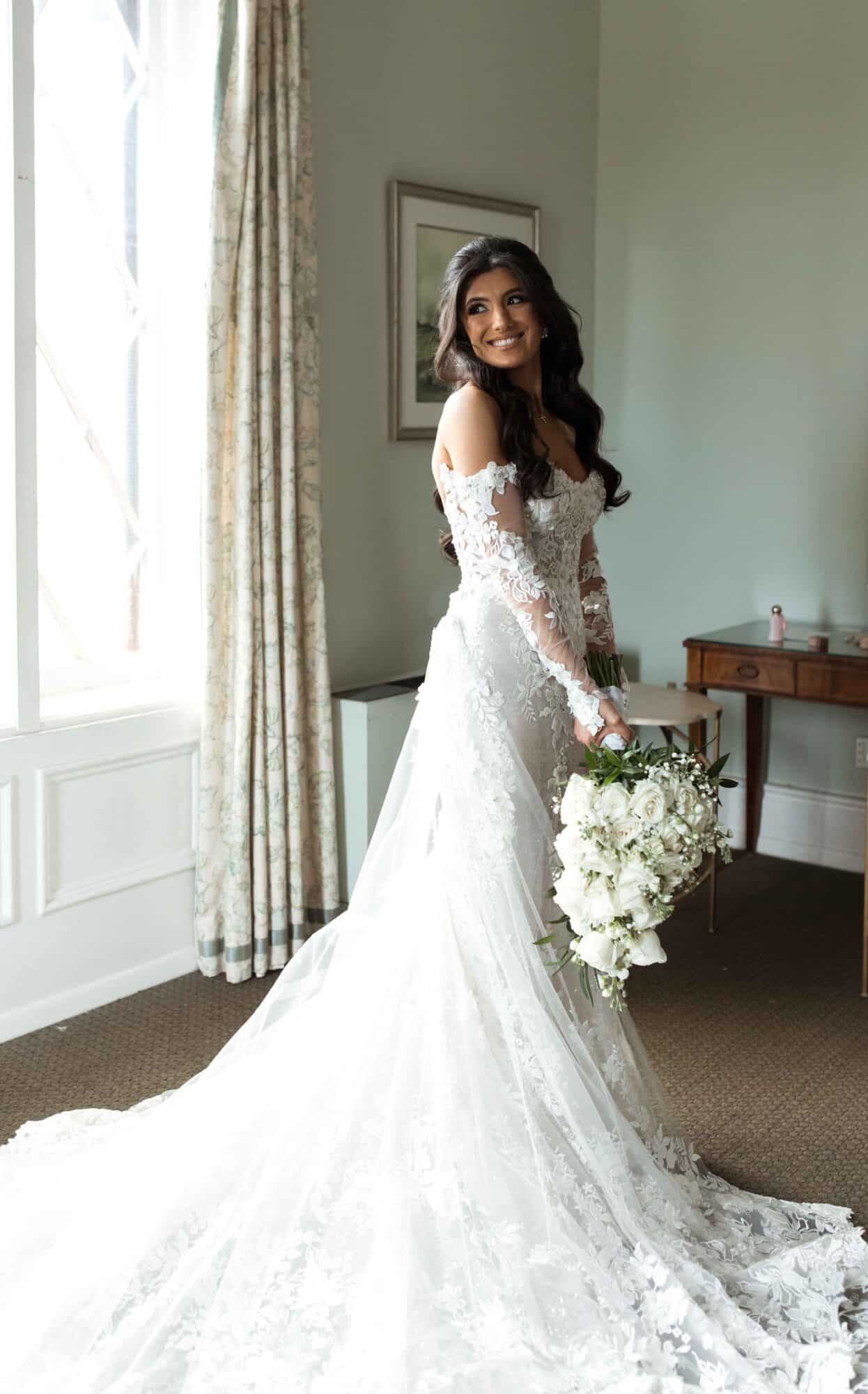 Step into a fairytale with Amanda, resplendent in Eve of Milady’s style 4405 gown, adorned in Ivory/Blush/Nude hues, featuring a hand-beaded sculptured neckline and a sheer bodice. Her look was completed with a matching removable skirt, embellished with intricate beadwork and embroidery, cascading into a chapel train.