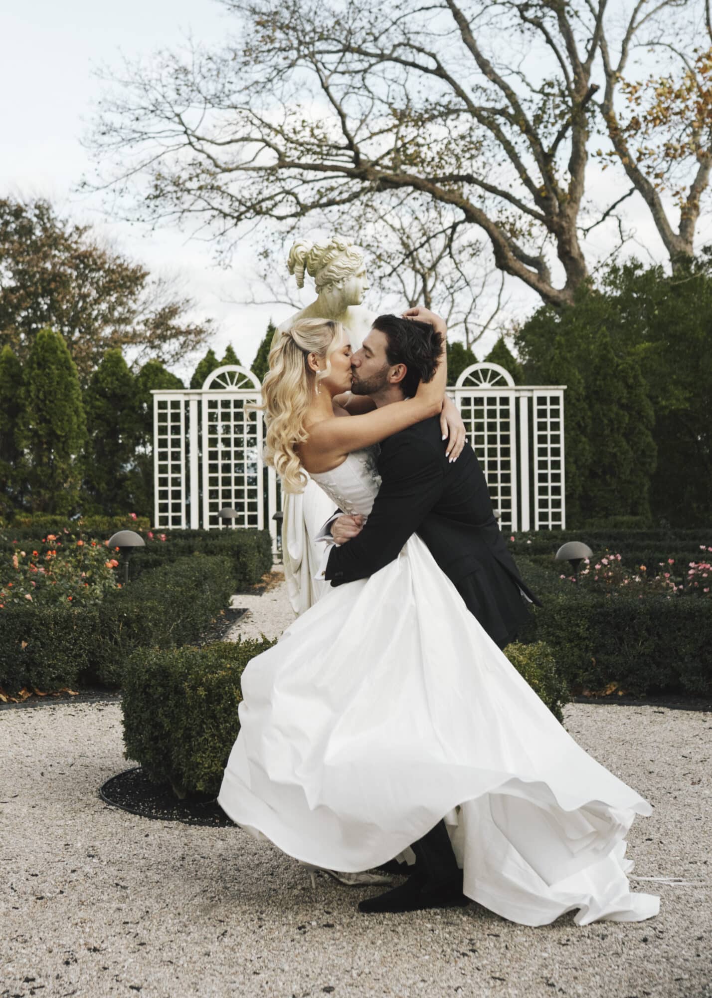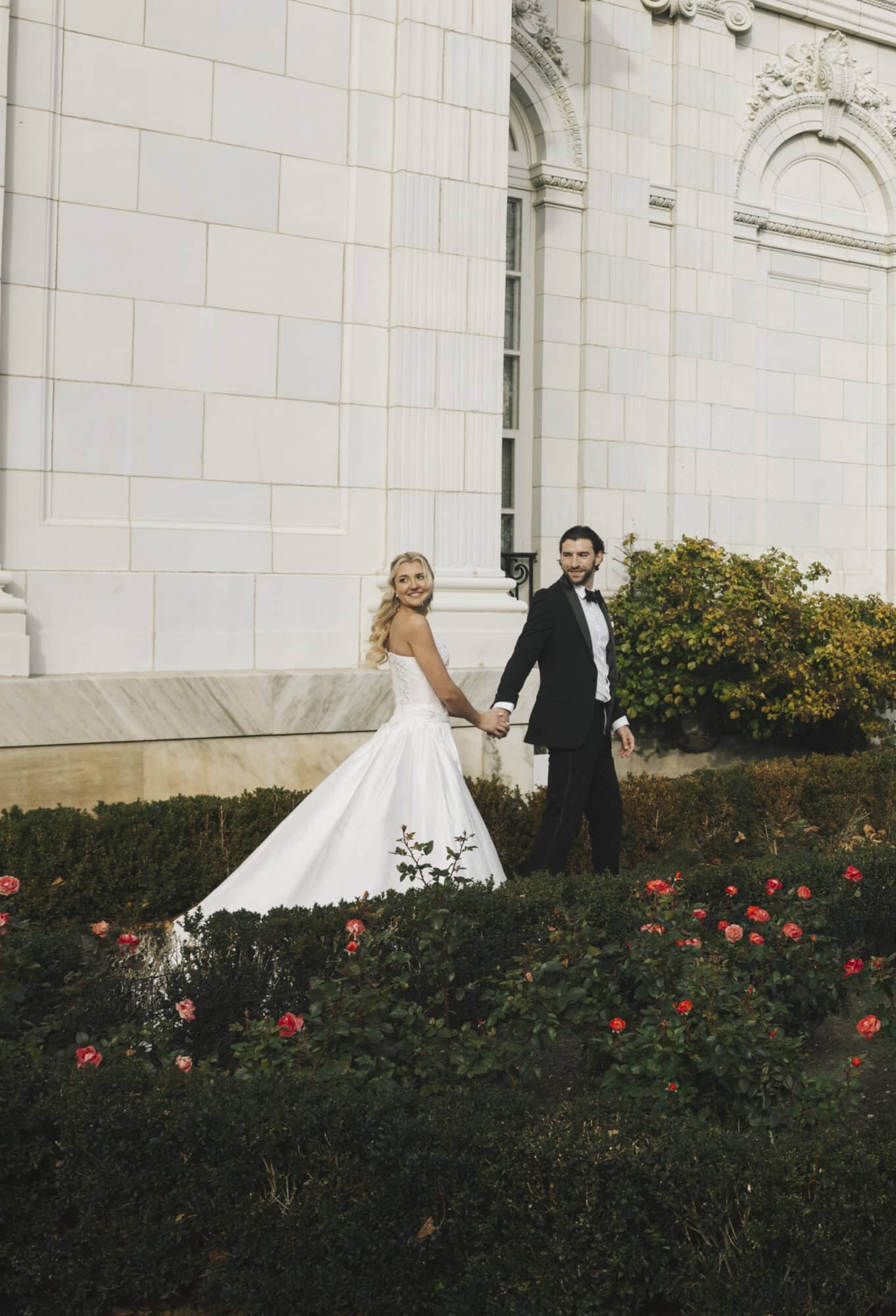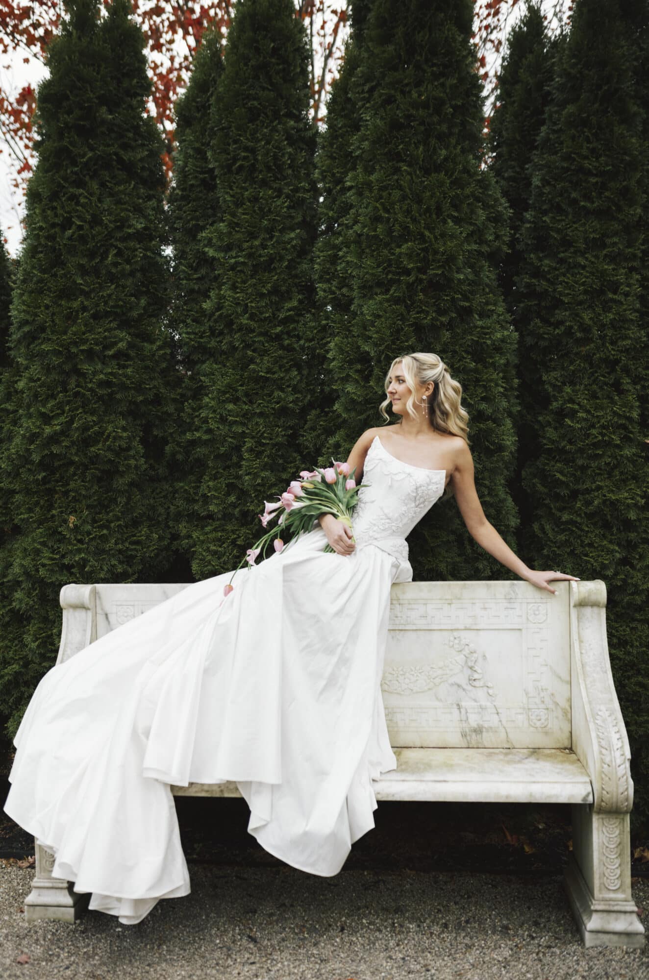 Set against the iconic backdrop of Rosecliff Mansion at the Newport Mansions, Amelia’s look felt right at home among gilded architecture and sweeping ocean views. The grandeur of the venue elevated the gown’s opulence, creating a setting that was equal parts timeless and cinematic.