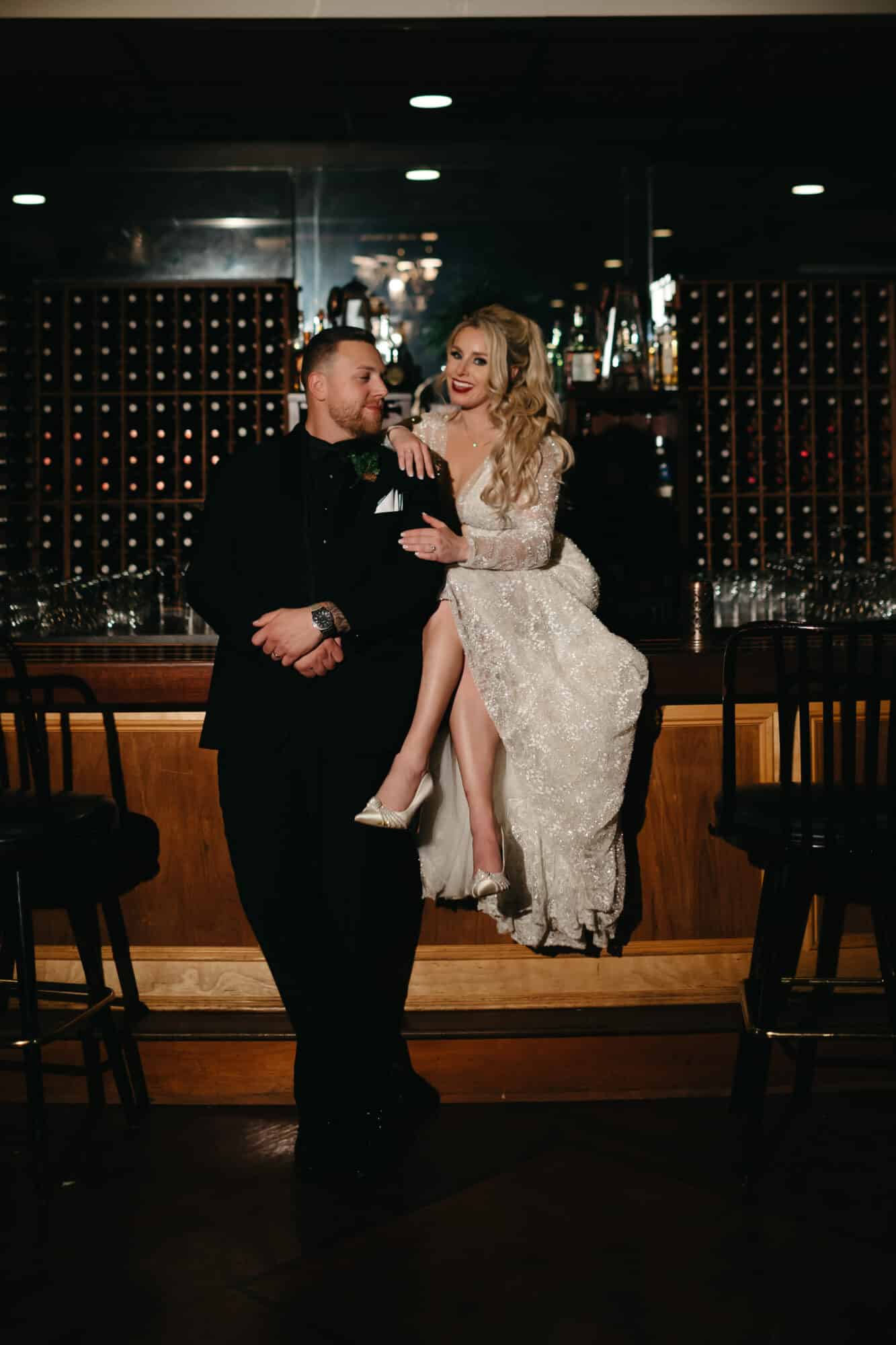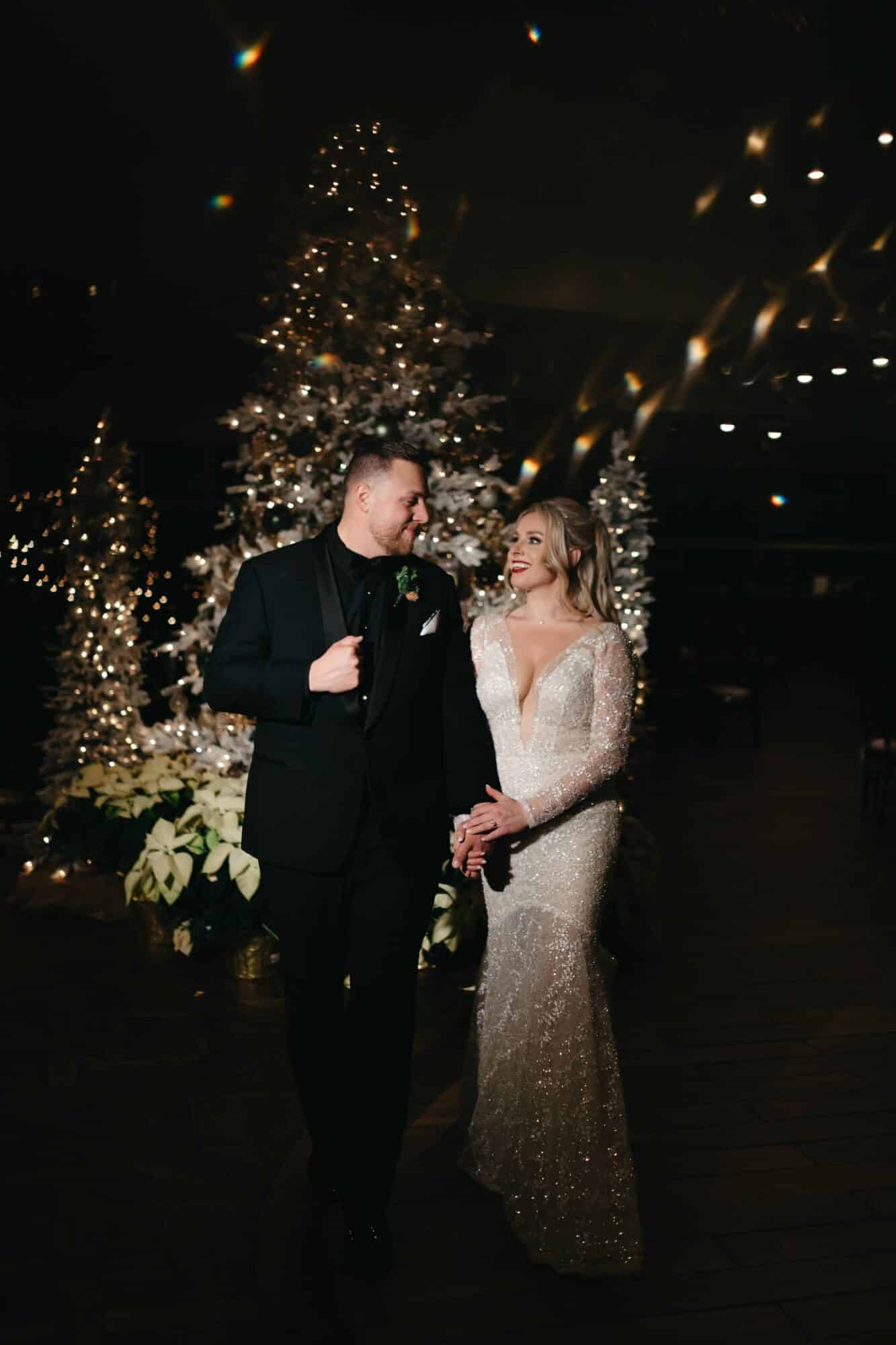 With a deep V back and detachable long sleeves, the gown offers versatility while maintaining its enchanting allure. As Bridget walks down the aisle, her presence steals the spotlight, captivating all with her radiant beauty and undeniable charm.