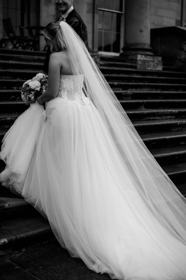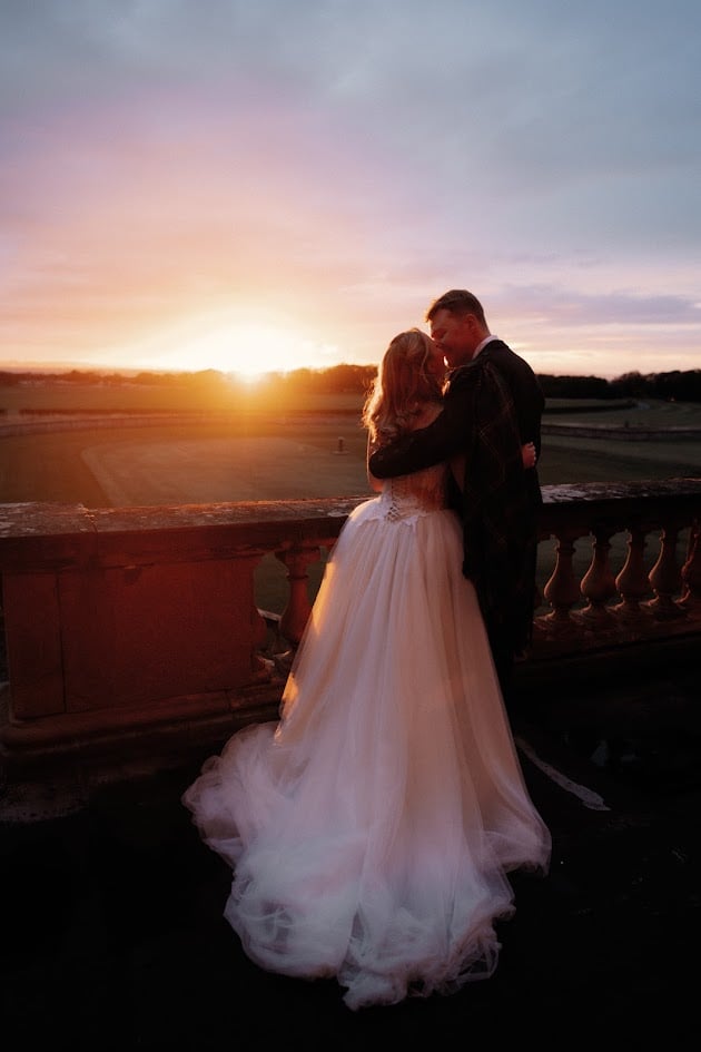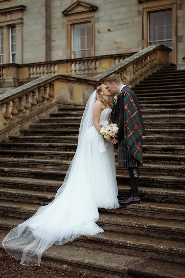 Cameron’s setting could not have been more fitting. Nestled in the Scottish countryside, Gosford House provided a historic and elegant backdrop, with its grand interiors, sweeping grounds, and stately atmosphere elevating every moment of the day. The venue’s old-world charm paired seamlessly with the couture craftsmanship of the gown, creating a wedding aesthetic that felt cinematic and refined.