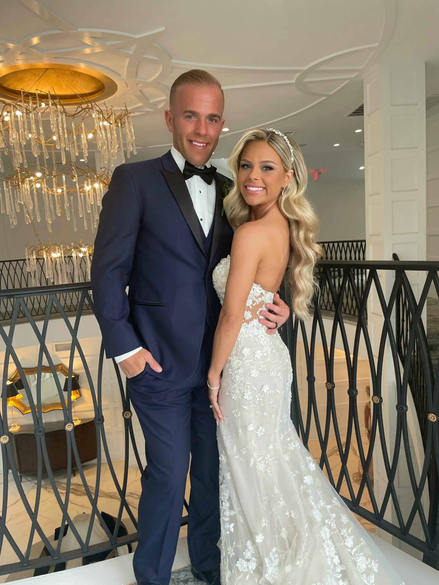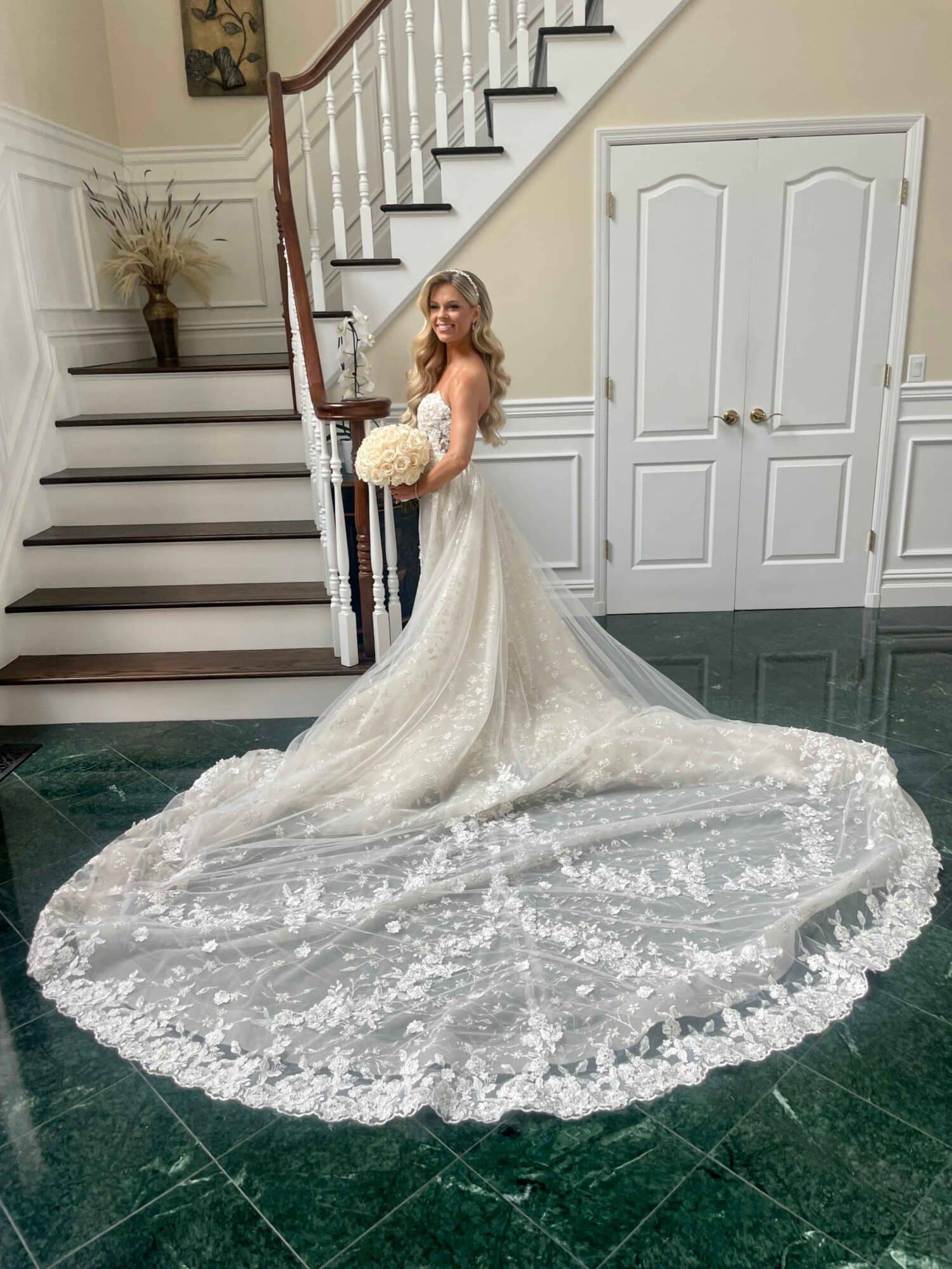Stepping into her fairytale moment, Gabrielle radiated pure elegance in the enchanting Style 4406 gown from Eve of Milady’s Couture Wedding Dress Collection. A true masterpiece of craftsmanship, this gown featured a strapless hand-beaded and embroidered bodice, perfectly complementing the fit-and-flare silhouette adorned with intricate hand beading and embroidery on the skirt. As she walked down the aisle, Gabrielle’s removable train and sleeves added an extra touch of glamour, culminating in a breathtaking chapel train that trailed behind her with every step.