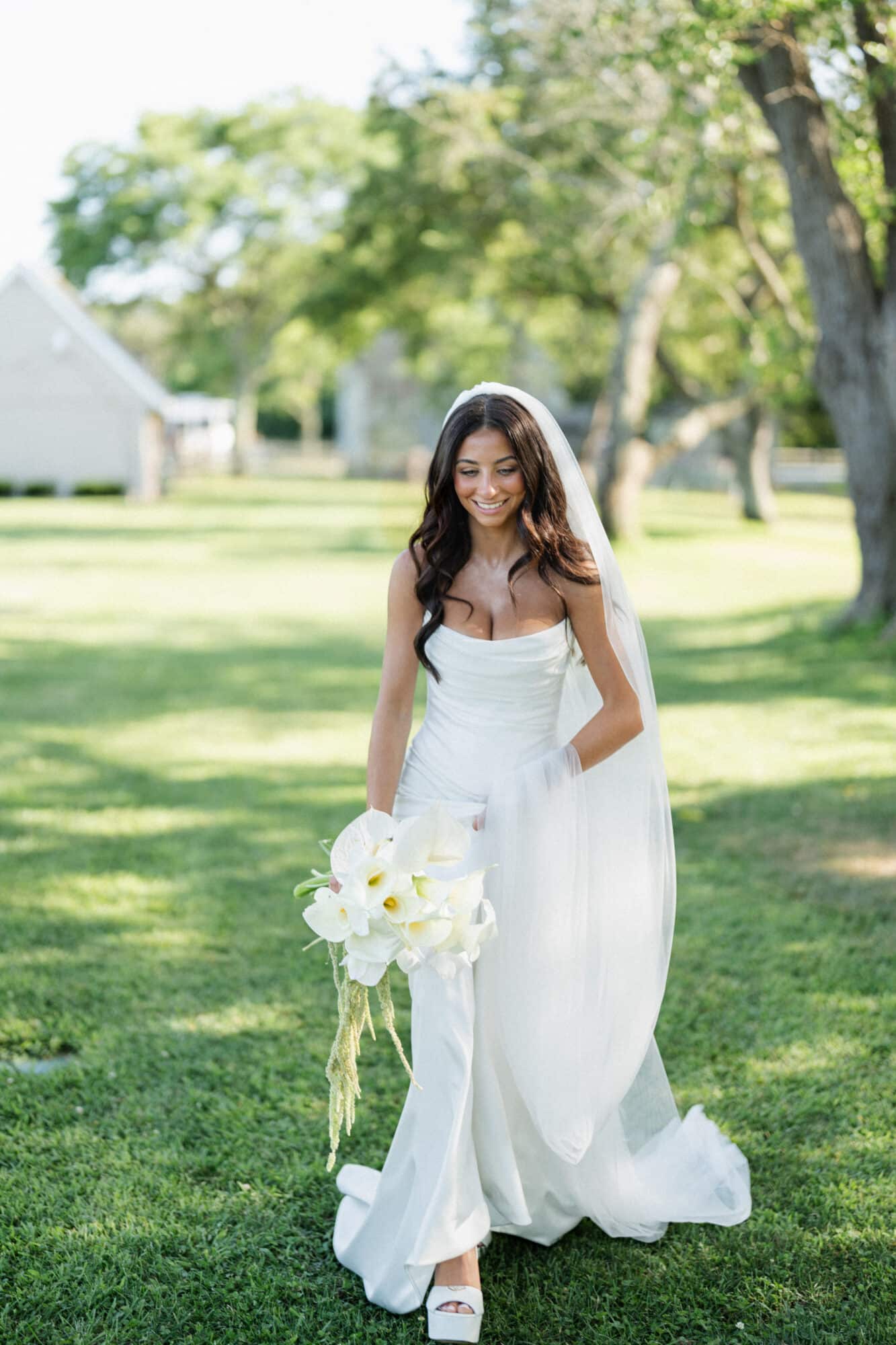 Crafted from sumptuous silk, Wylie featured a sleek slip silhouette that draped beautifully over Isabella’s figure, creating a clean and modern bridal statement. The strapless bodice was softened by a delicately draped neckline, adding movement and romance while maintaining the gown’s minimalist aesthetic. Every detail felt intentional and editorial, allowing Isabella’s natural beauty and confidence to take center stage.