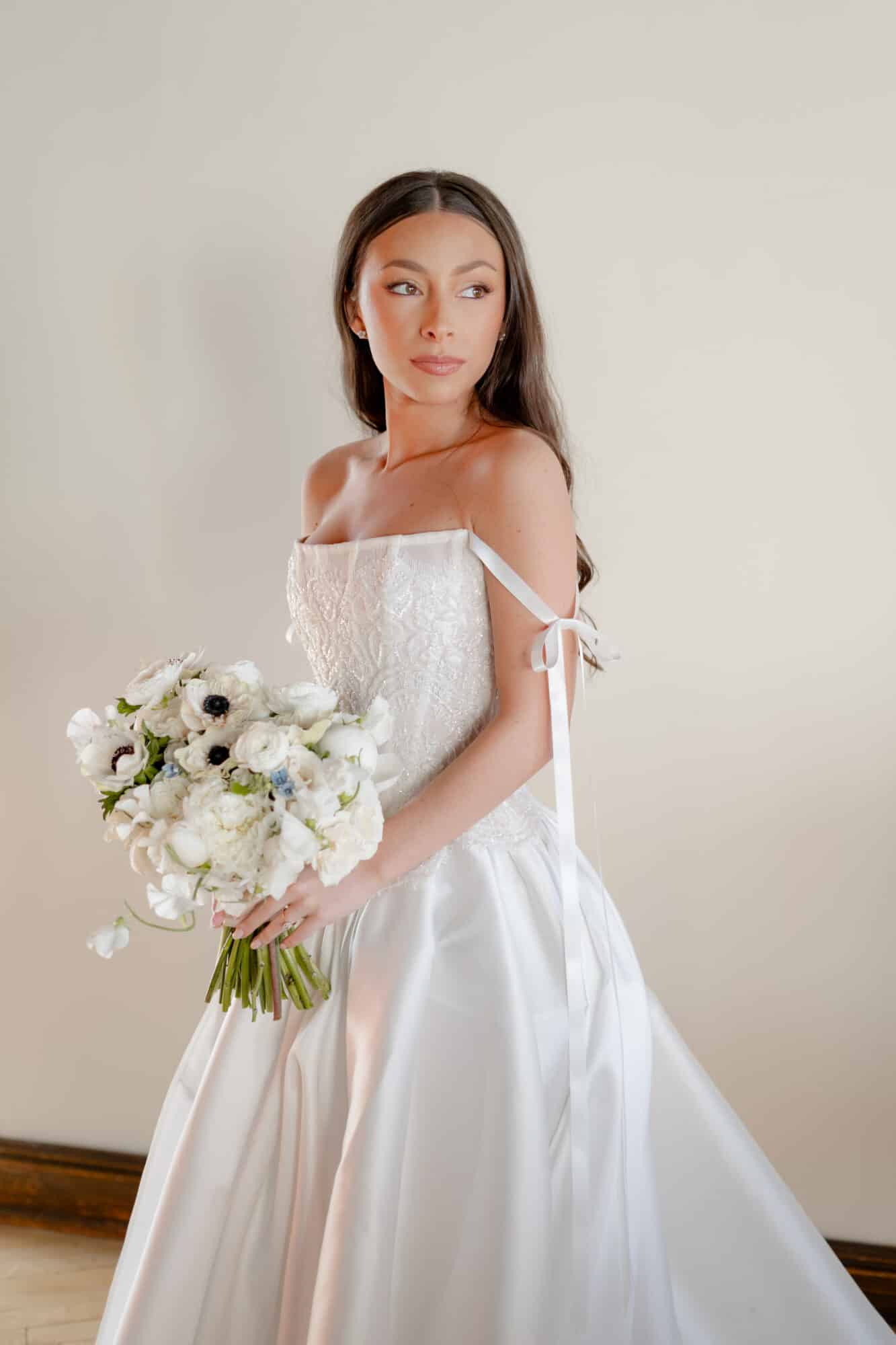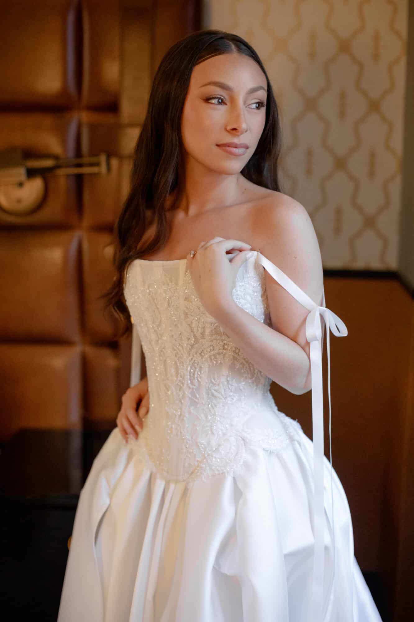 Augusta is a true statement piece — a structured corset gown adorned with intricate embroidered lace and finished with charming off-the-shoulder satin ribbon bows. Lindsay’s look was elevated even further with the gown’s majestic royal mikado skirt, featuring a dramatic thigh-high slit that added a touch of bold sophistication to her bridal style.