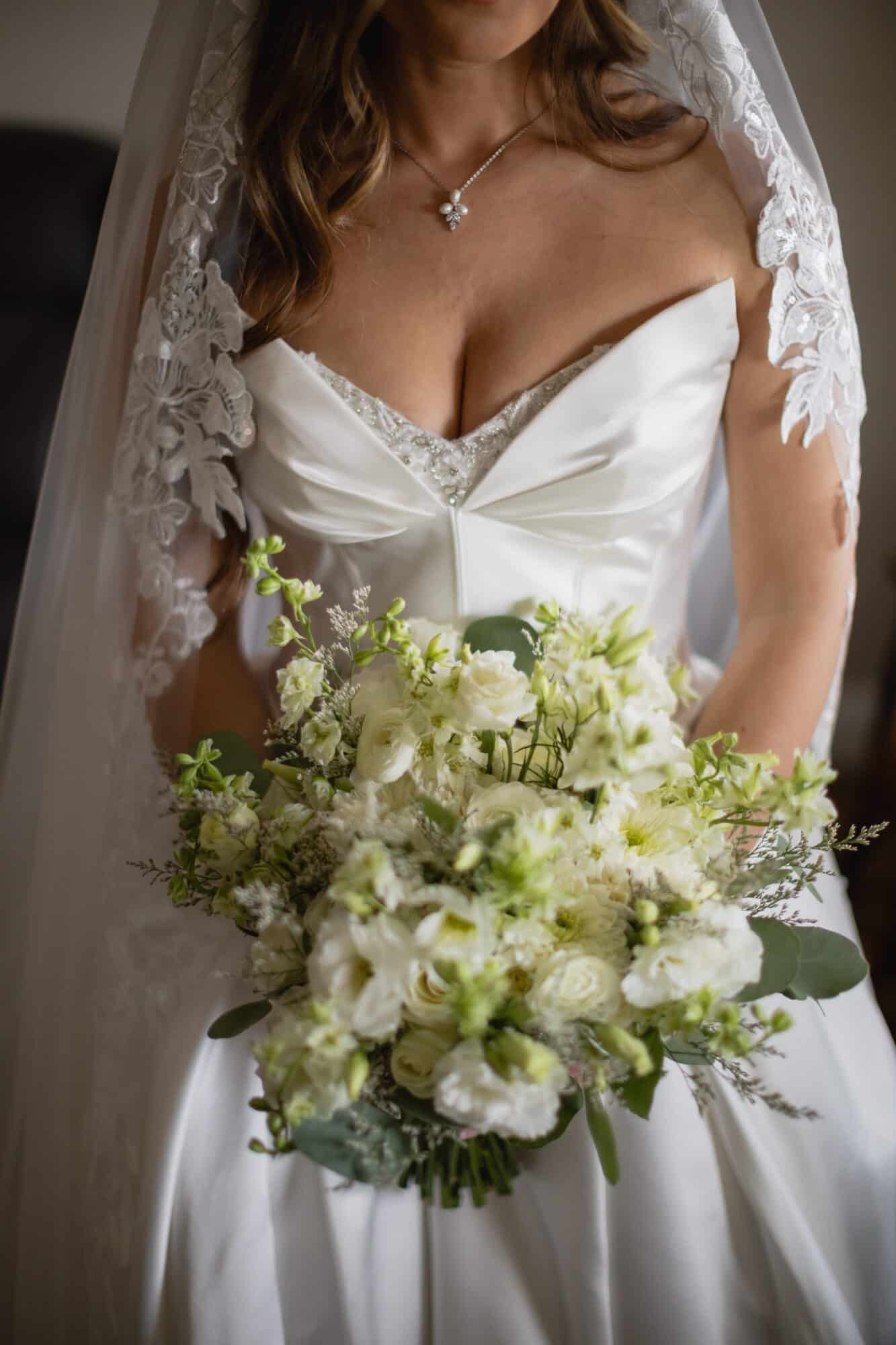 One of our favorite (and most practical!) details? Hidden pockets seamlessly built into the skirt — a modern bride’s dream that blends function with fashion. Flowing gracefully behind Lindsey as she walked down the aisle was a chapel-length train, adding drama and romance without overpowering the gown’s classic design. Every step felt intentional, regal, and undeniably bridal.