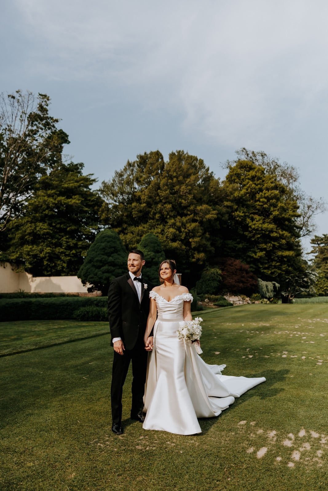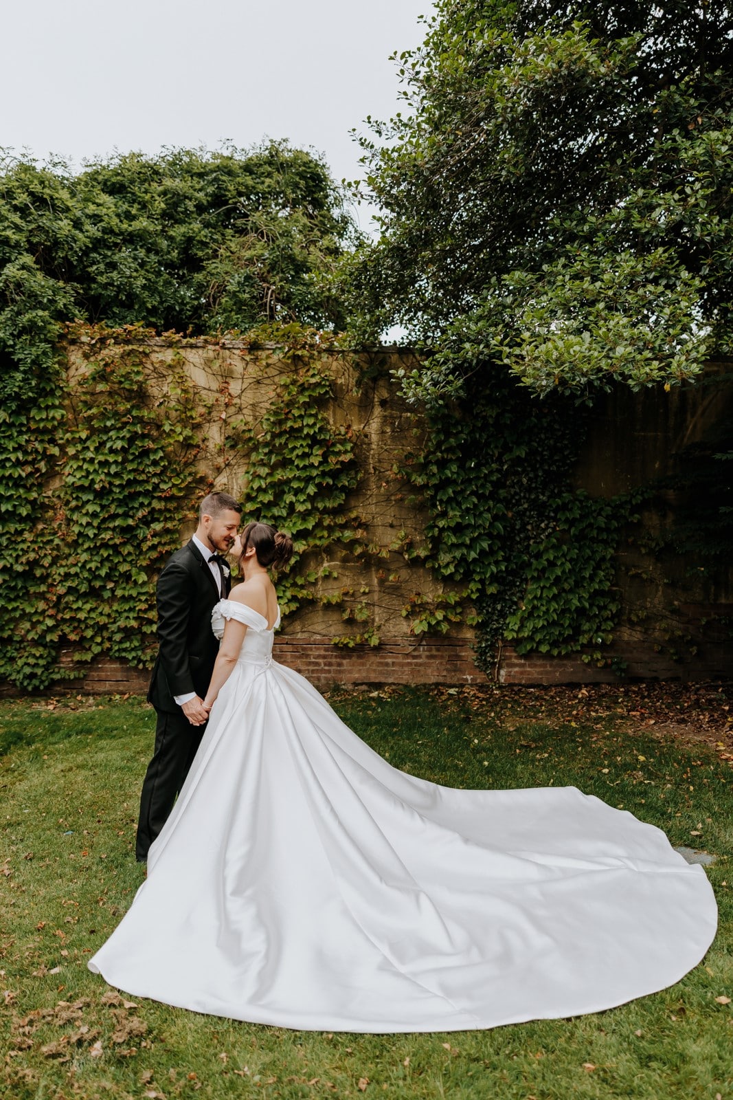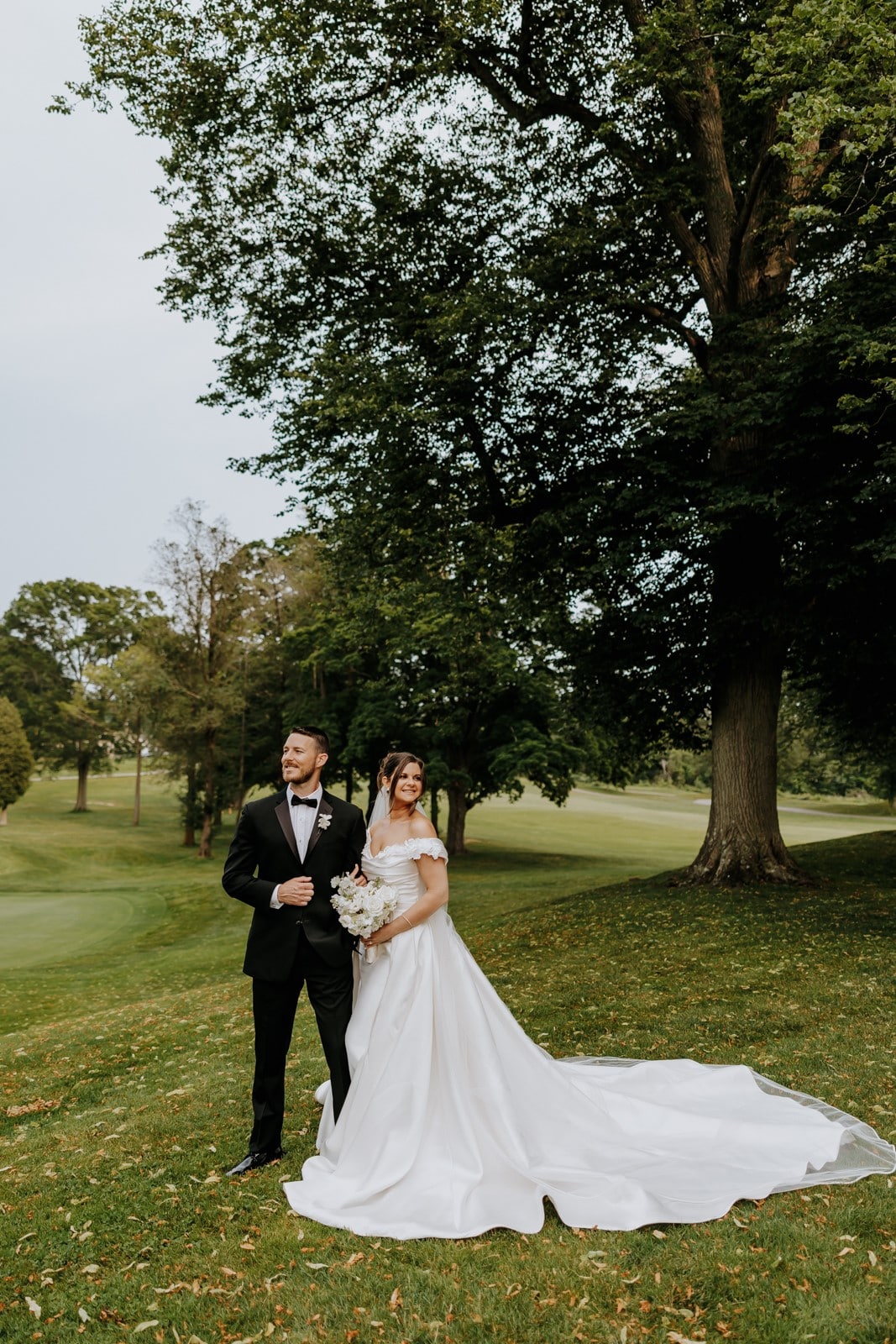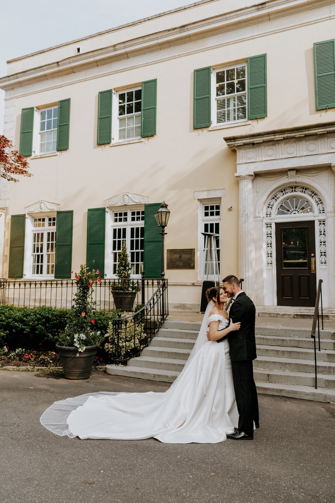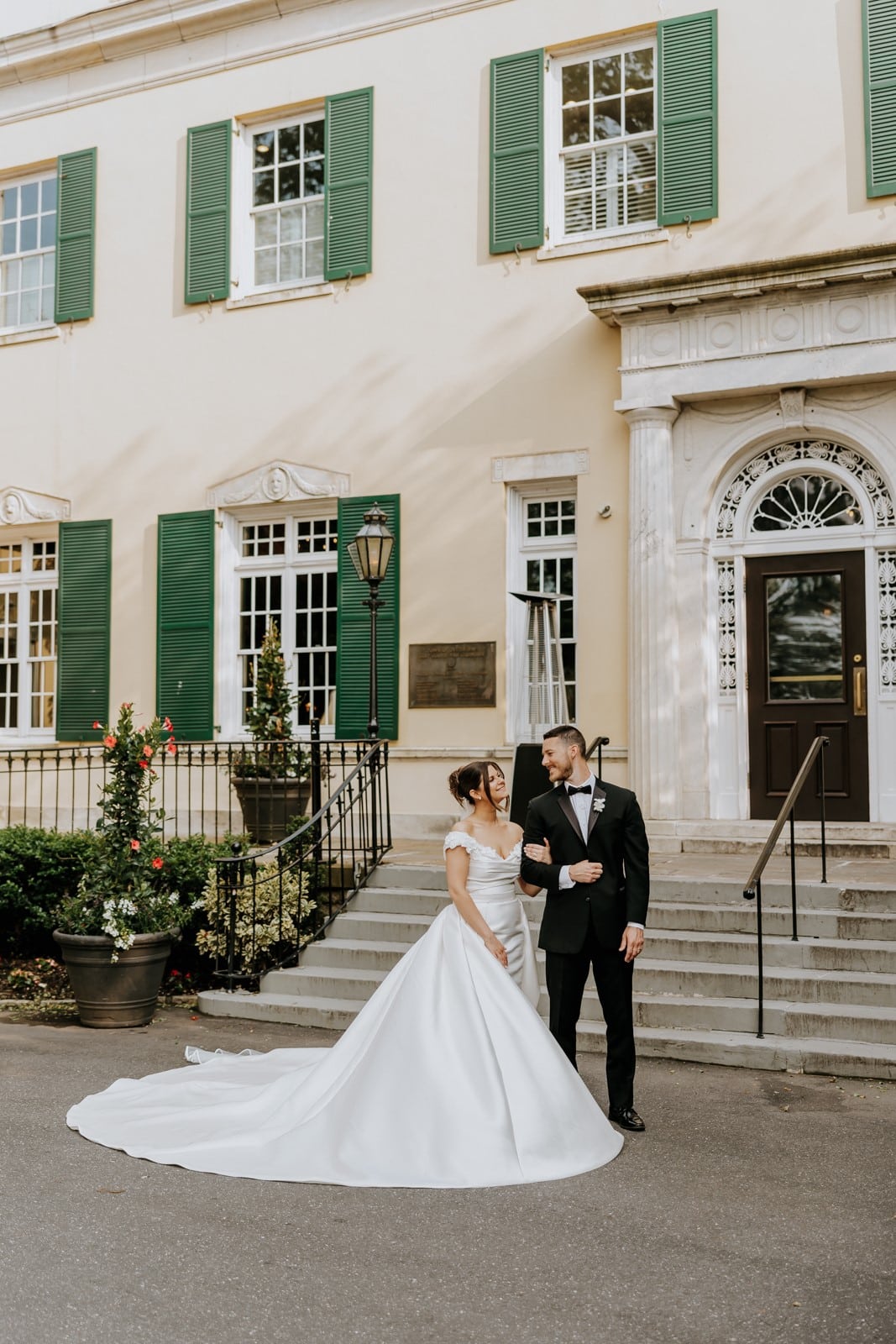 Marissa’s wedding day at The Mansion at Oyster Bay was a perfect blend of timeless elegance and modern romance. For such a stunning celebration, she wore the Luciana gown by Milla Nova—an off-the-shoulder ivory mermaid masterpiece made of luxurious Mikado. This sleek silhouette hugged her curves with grace, while the short train added just the right touch of drama for her walk down the aisle.