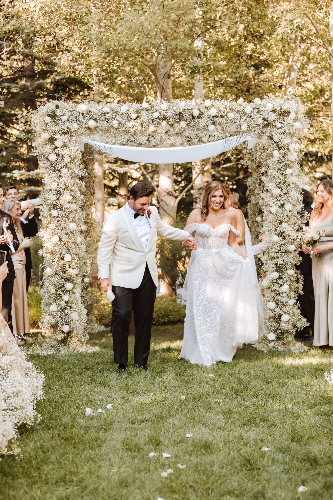 Paulina mesmerized as she glided down the aisle in the exquisite Tyra gown by Gala by Galia Lahav, a vision of opulence and grace. This silver ballgown, adorned with a sheer sweetheart corset crafted from glitter tulle, exuded timeless glamour. The chapel train trailed behind her, a breathtaking accent to her radiant presence.