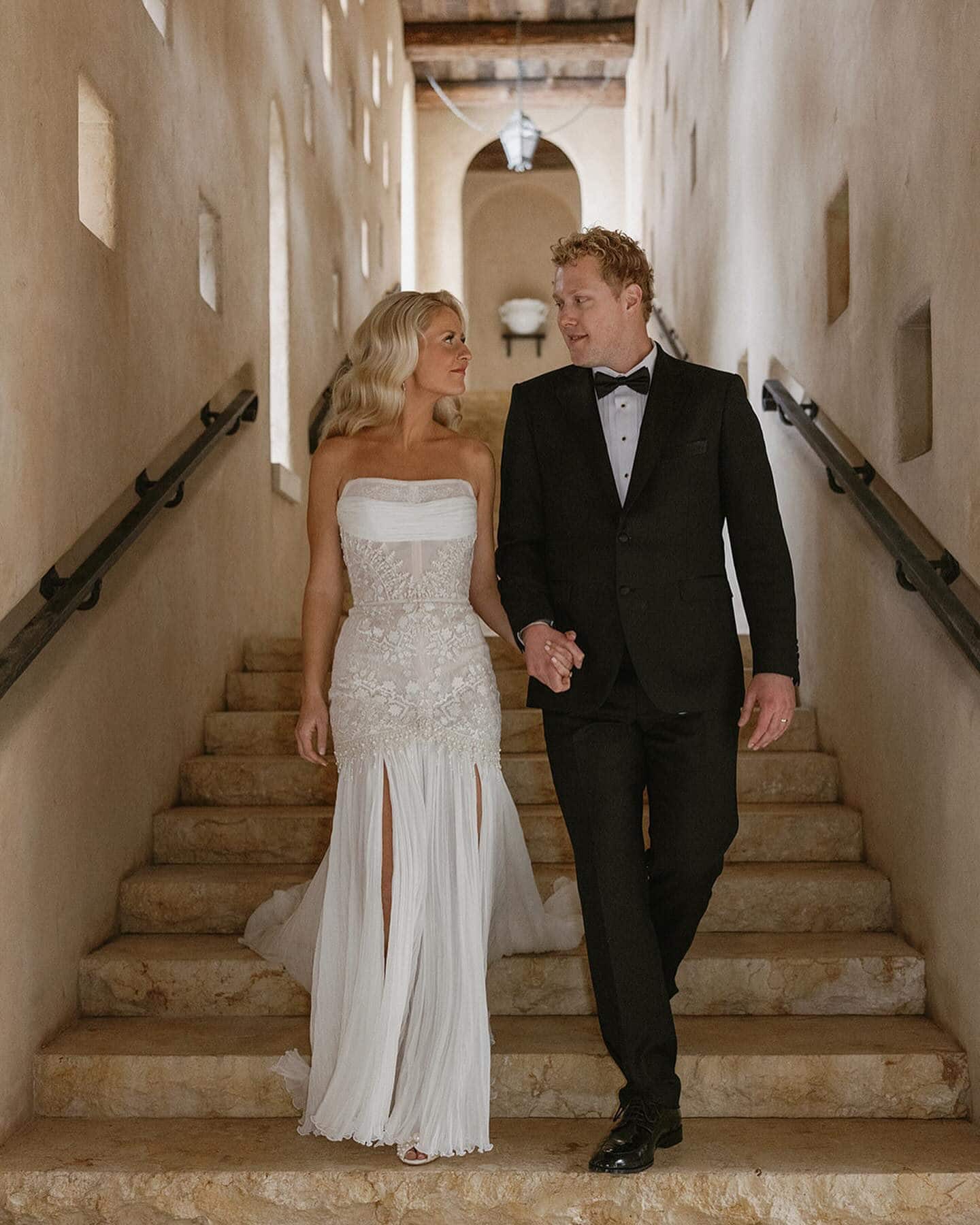 Step into a world of unparalleled beauty and sophistication as Quinn, our enchanting bride, graces her special day adorned in the breathtaking Giovanna gown from the Kim Kassas Couture wedding dress collection. A masterpiece of design and craftsmanship, the Giovanna gown captures the essence of timeless elegance with its Indian lace corset bodice adorned with pearl beaded accents, perfectly complemented by a voluminously paneled silk chiffon skirt. But the allure doesn’t end there. Quinn’s ensemble is elevated to celestial heights with a matching statement cape made of exquisite Indian lace, adding a touch of regal grandeur to her bridal ensemble.
