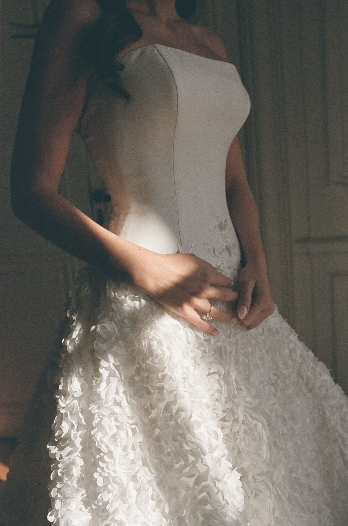 Each detail of Bijou tells a story of couture artistry. The intricate florals add a soft romanticism, while the structured design maintains a polished, fashion-forward edge. The result is a gown that seamlessly blends classic bridal grandeur with contemporary design ideal for a bride seeking something both timeless and unforgettable.