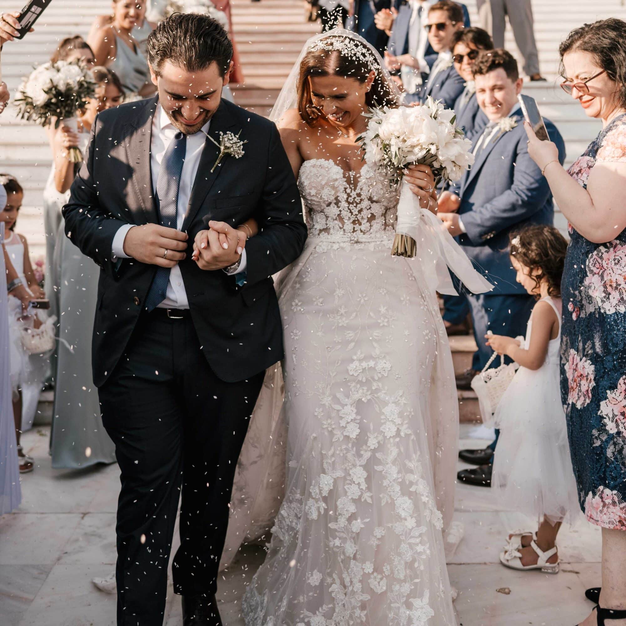 In a captivating symphony of handcrafted elegance, Sandy illuminated her wedding day in style 4406 from the revered Eve of Milady Couture Collection. The strapless silhouette boasted a meticulously beaded and embroidered bodice, a testament to the artistry of the couturier. As she glided down the aisle, the fit-and-flare silhouette adorned with intricate hand beading and embroidery on the skirt exuded a regal charm that captured every gaze. The ensemble’s versatility shone through with removable sleeves and a detachable train, allowing Sandy to transition seamlessly from ceremony to celebration.