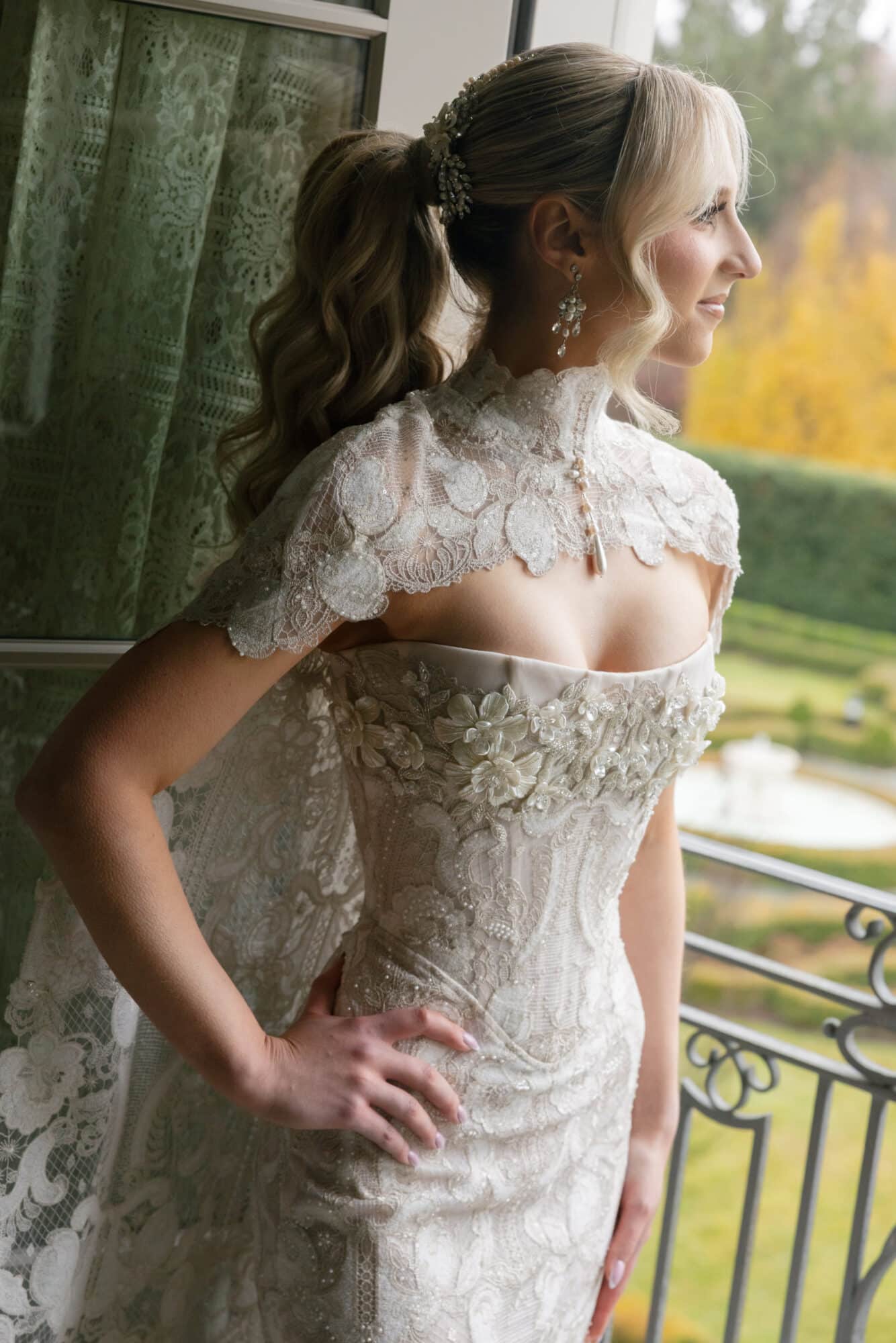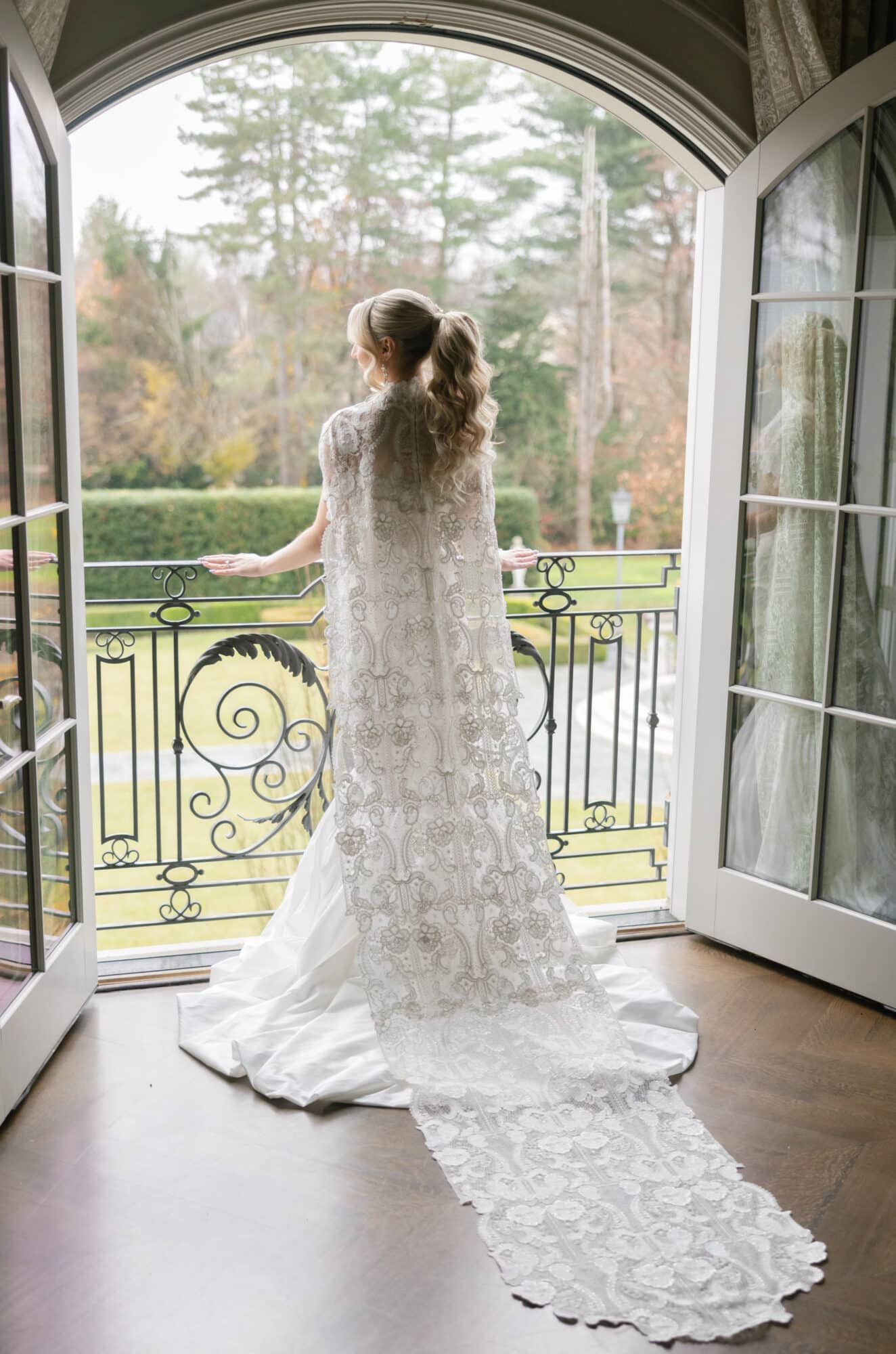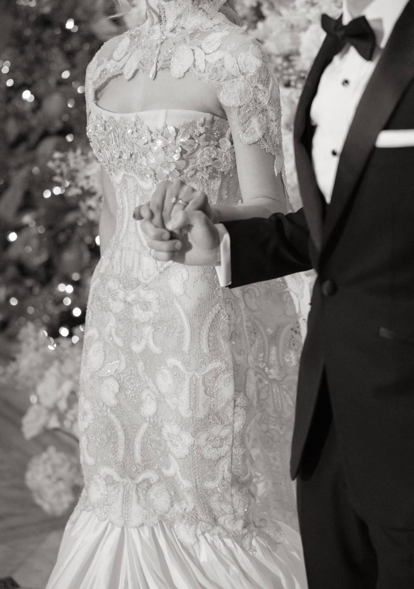 Completing the look, Sara paired her gown with a matching silver and ivory Indian embroidered lace cape, adding an ethereal, fashion-forward layer to the ensemble. The cape draped effortlessly, enhancing the gown’s drama while maintaining a refined elegance that felt both modern and timeless. For the finishing touch, Sara chose a veil from Boutique de Voile a two-tier circular bias edge cathedral veil with satin trim. The clean satin edging framed the gown beautifully, adding softness and movement while allowing the intricate detailing of the dress to shine.