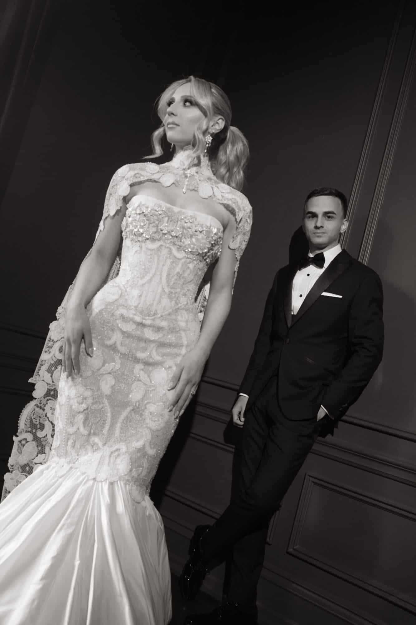 For bride Sara, her wedding day look was nothing short of couture artistry. She chose Amaya by Kim Kassas Couture, a breathtaking statement gown that blends regal drama with intricate craftsmanship perfect for a bride who wanted to leave a lasting impression.