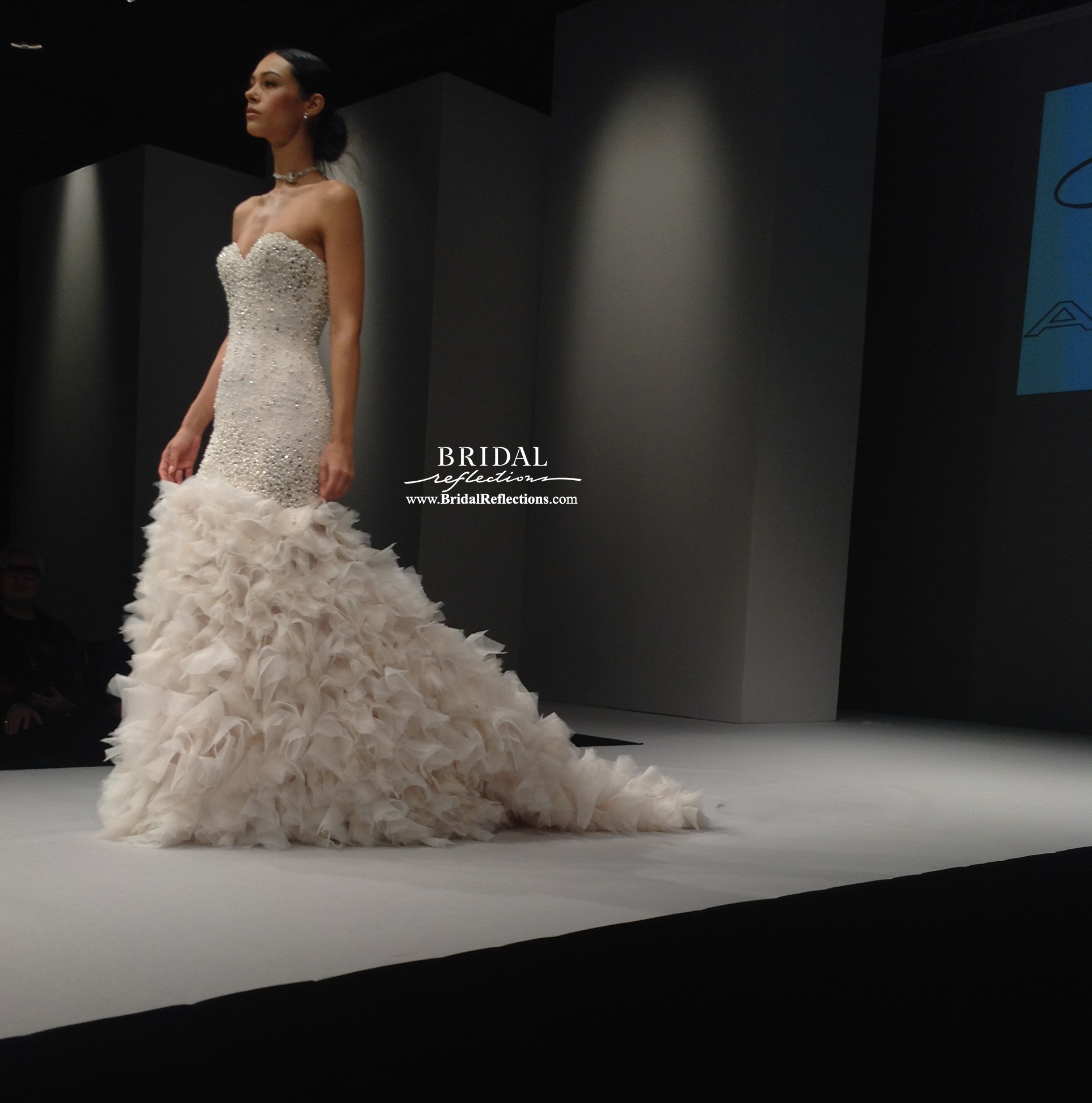 The Spring 2016 Eve of Milady collection is strikingly breathtaking. As the models walked down the runway each and every one of them looked like royalty. Drenched in beautiful Ivory/Blush fabrics, champagne lace and sparkle tulle, sheer hand beaded bodices, full layered whimsical skirts with sequins all around and gorgeous fit and flare three dimensional bodice beading. If you want your fantasy wedding dress to come true then the Eve of Milady Spring 2016 collection will be the perfect choice to fulfill your dreams!